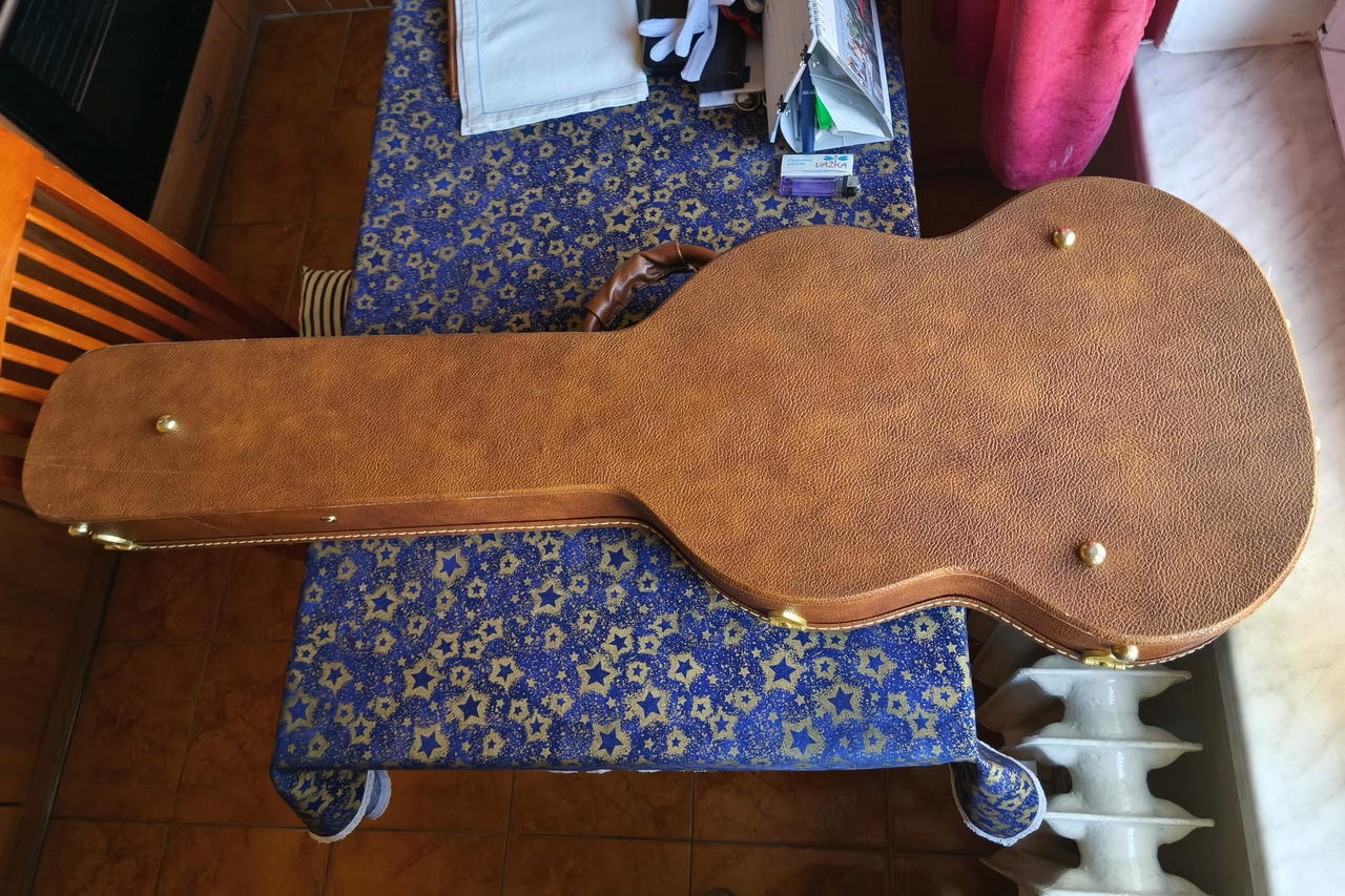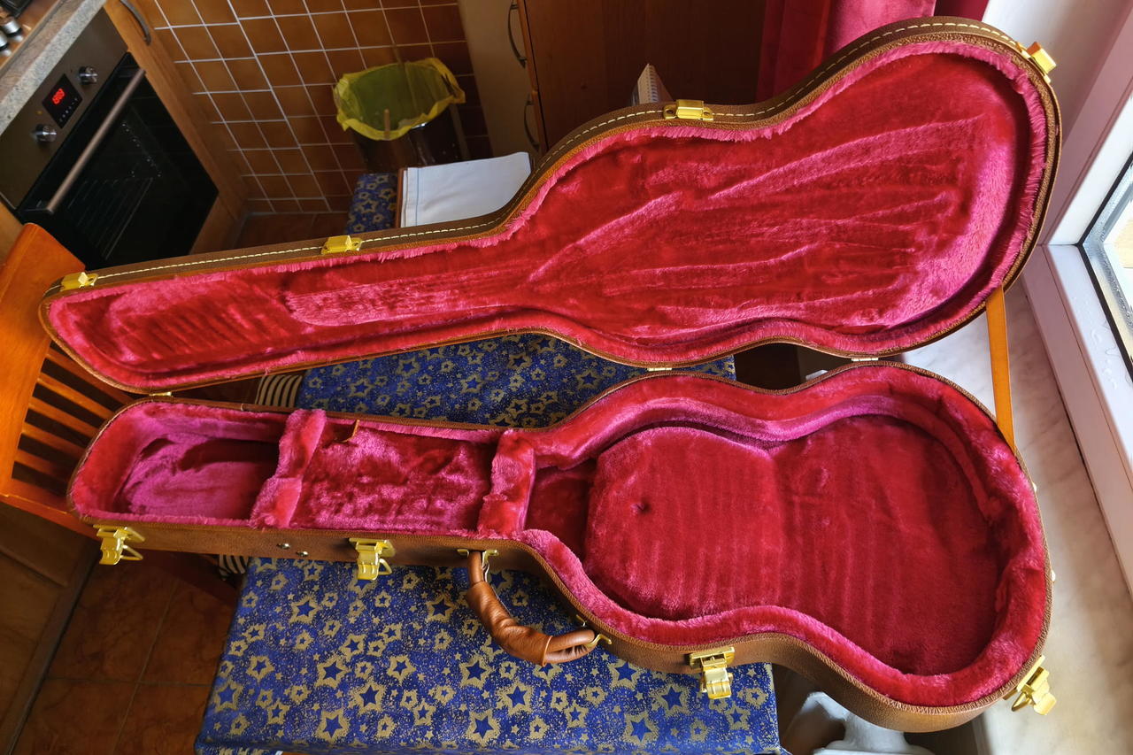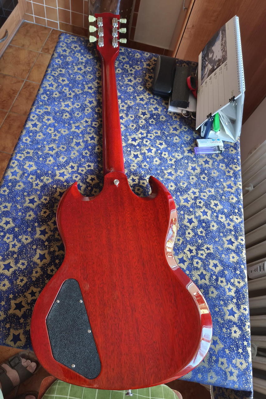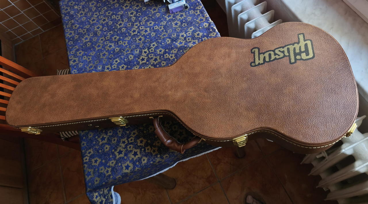 Prodám deset blet starou elektrickou kytaru Gibson SG Standard Traditional v barvě Heritage Cherry s originálním luxusním hnědým kufrem Gibson. Kytara byla vyrobena v Nashvillu v Tennessee v roce 2016, je ve vynikajícím stavu s pouze lehkými povrchovými škrábanečky a stopami po trsátku. Tělo a krk jsou vyrobeny z mahagonu, hmatník z indického palisandru s akrylovými lichoběžníkovými značkami pozic. Nástroj váží 3,08 kg, délka menzury je 628,6 mm a šířka nultého pražce je 42,71 mm. Ladicí mechaniky jsou Gibson Deluxe Kluson, kobylka Tune-O-Matic a snímače 490R a 490T.
