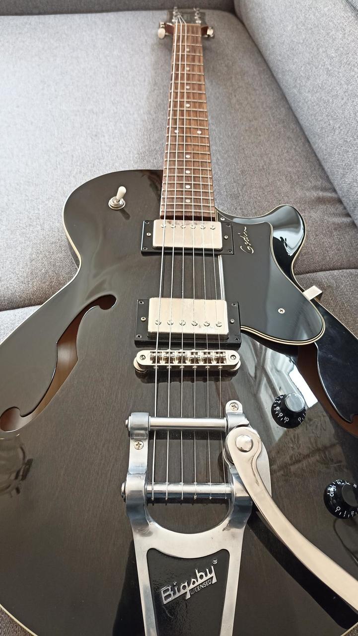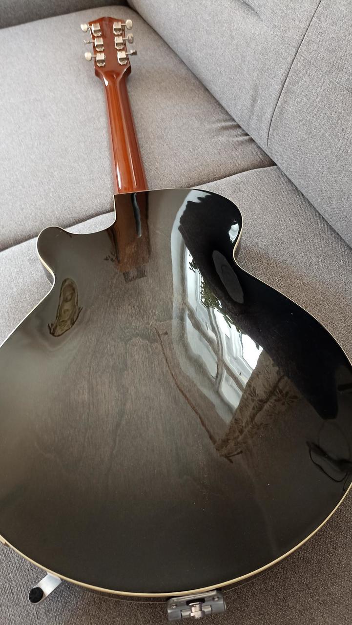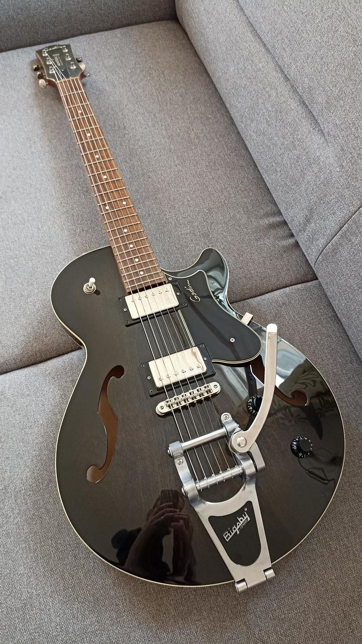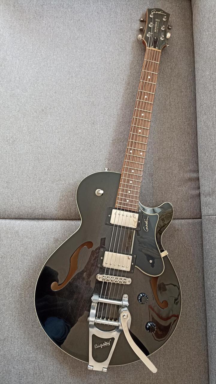Krásná pololubovka, od prvního kontaktu víte, že si na tom nástroji někdo dal záležet. Ladění drží dokonale, použitelná do nejrůznějších žánrů od jazzu po blues a rock. Má docela unikátní konstrukci, není úplně dutá, ale nemá ani masivní středový blok. Uvnitř je něco jako Karlův most (viz fotka), takže to nevazbí, ale zároveň si to nechává dost akustický nádech. A ušetří se tím na váze, je výrazně lehčí než všechny klasické pololubovky. Také nemá takové ty nosové vyšší středy, jak mívají es335, zvukové spektrum je vyrovnanější. Krk mi přijde takový baculatější, radius 12, drží se příjemně. (Na videu stejná, jen v jiné barvě.) Včetně původního měkkého obalu Godin. Prodávám, protože zůstávám u celolubovek.