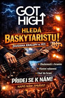 Ahoj. Jsi pohodovej týpek co má rád rockovou muziku a hraje na baskytaru? Možná právě tebe hledáme. Jsme kapela GotHigh z Kralup nad Vltavou s vlastní zkušebnou i vybavením tamtéž. Hrajeme výhradně svoje věci, poslechnout si nás můžeš na Spotify, Youtube nebo mrkni na FB. Čeká nás celkem brzy i pár koncertů, takže nejdřív bude potřeba aby ses naučil playlist a pak bude spousta času dělat na novejch věcech. Tak co, máš chuť to s náma zkusit? Na nic nečekej a ozvi se nám na gothighband@gmail.com