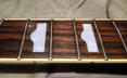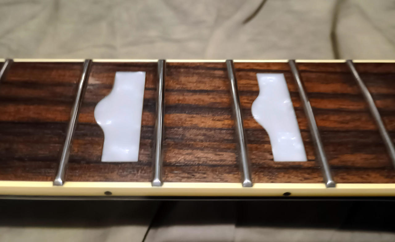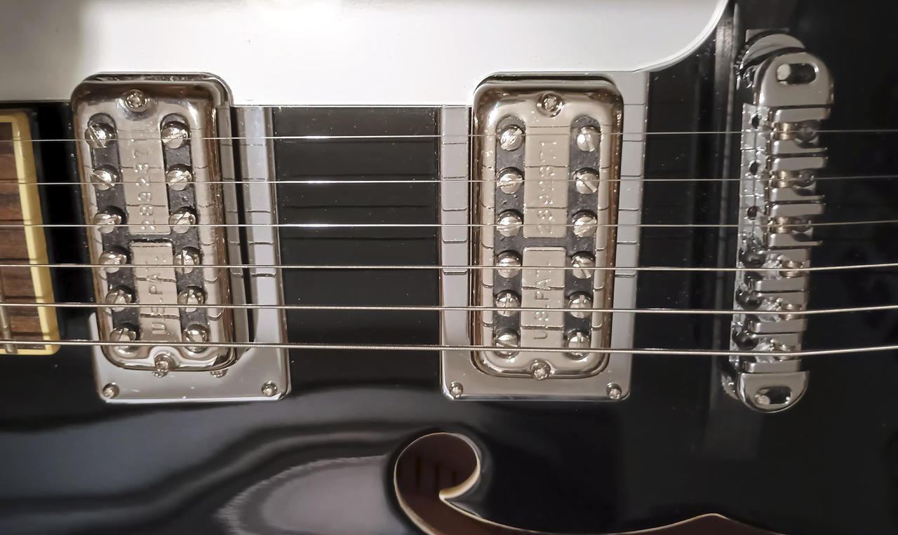 Snímače Gretsch Filtertron s vyraženým číslem patentu a kovovými rámečky, kobylka s rolnami. Nádherná kresba dřeva palisandrového hmatníku (pražce také ve 100% stavu a v lesku, konce pražců precizně zabroušené), nultý pražec kost, nové struny D´Addario 10/46