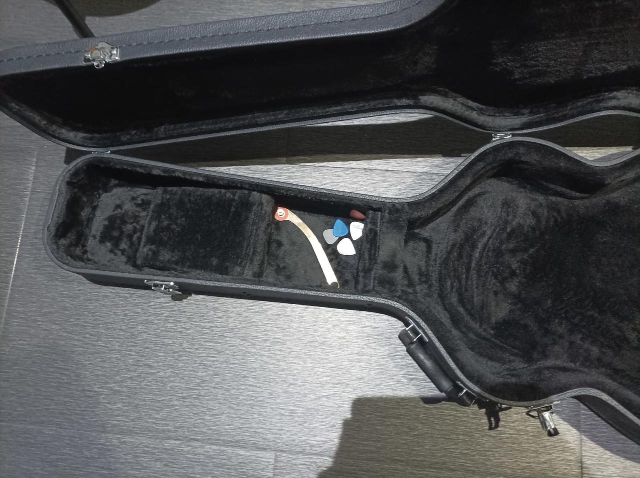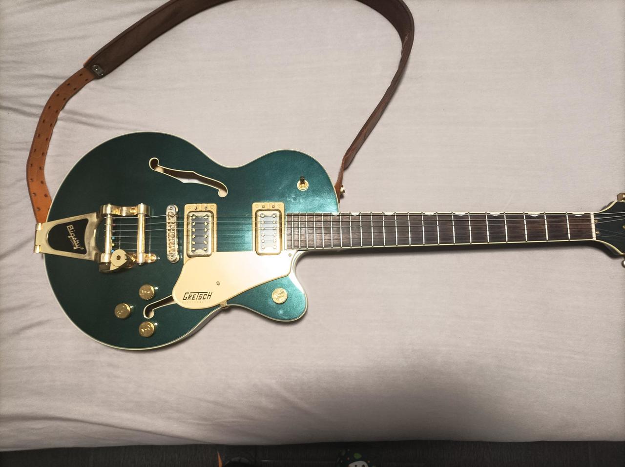 Kompaktnější čtrnáctipalcové tělo pololubového single-cut modelu G5655TG Electromatic CAG je zhotoveno z vrstveného javoru. Komorovaný smrkový středový blok vyztužuje přední desku kytary a snižuje náchylnost nástroje na nežádoucí “vazbení”. K javorovému krku s profilem Thin „U“ je přilepen hmatník z fíkovníku osazený dvaadvaceti pražci velikosti Medium Jumbo. Orientaci na hmatníku usnadňují offset polohové značky z imitace perleti (Neo-Classical Thumbnail). Součástí kytary i popruh Alhambra Guitar Strap Engraved: Jednoduchý popruh, který díky nadstandardní šířce šesti centimetrů a pětimilimetrovému latexovému polstrování je velmi pohodlný a unikátní systém Righton Adjustment System zajišťuje snadnou nastavitelnost délky. Dále je zde pěkná schovka na dvě trsátka, abyste je měli vždy po ruce. A v poslední řadě je zde Gretsch G2622T Streamliner Center Block Case: Tento stylový case je navržený spíše na míru pro elektrické kytary Gretsch jako jsou modely Streamliner G2622 / G2622LH / G2622T. Tento case byl však pro tuto kytaru vhodý kvůli Bigsby B70 tremolo. Tato vibrapáka se v tomto kufru nemačká, čili prostor obalu vám nerozdrbe ladění kytary. Interiér disponuje měkkým černým plyšem, který přináší ten nejvyšší komfort a kytara v ní nelíta. K vyzkoušení a vyzvednutí Brno-venkov jih.