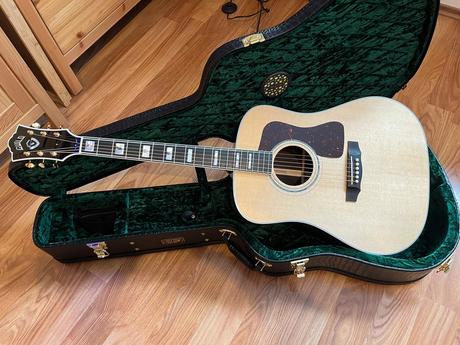 Vlaková loď značky Guild Jen vážní zájemci! Poštou neposílám. Jen osobní převzetí. Bílina, Most Teplice, po dohodě Praha Kytara kupovaná 08/2023 v Německu. Cena nové kole 110.000 Kč Doklady a certifikace 100% stav, jako nová, bez závad. Hraná pouze ve studiu a doma Styl: Dreadnought Masivní deska: AAA smrk Zadní strana a boky: masivní palisandr 3-dílný mahagon / ořech / mahagonový krk Hmatník: Eben Perleťové vykládání hmatníku Ušňovité boční bodové vykládání Poloměr hmatníku: 12" Rybinový krční spoj Měřítko: 651 mm Šířka matice: 43,0 mm 0 pražců Kostní ořech Most: Ebony Sedlo: Kost Čepy můstku: Kost Abalone rozeta Picguard želvího krunýře Pozlacené otevřené strojní hlavy Gotoh řady 700 Pozlacený hardware Barva: Přírodní Snímač. L.R. Baggs Anthem Včetně luxusního pevného pouzdra Vyrobeno v USA