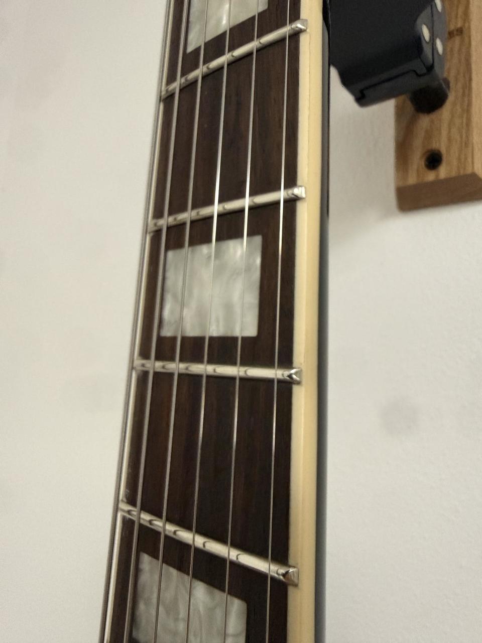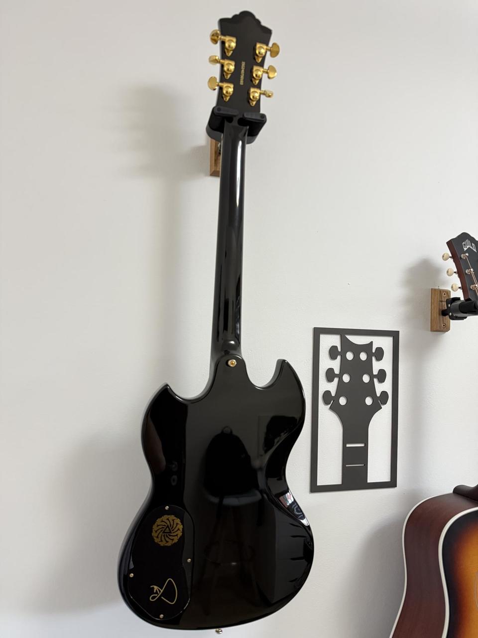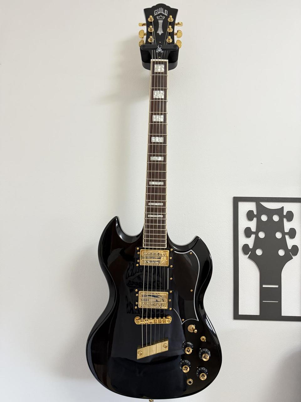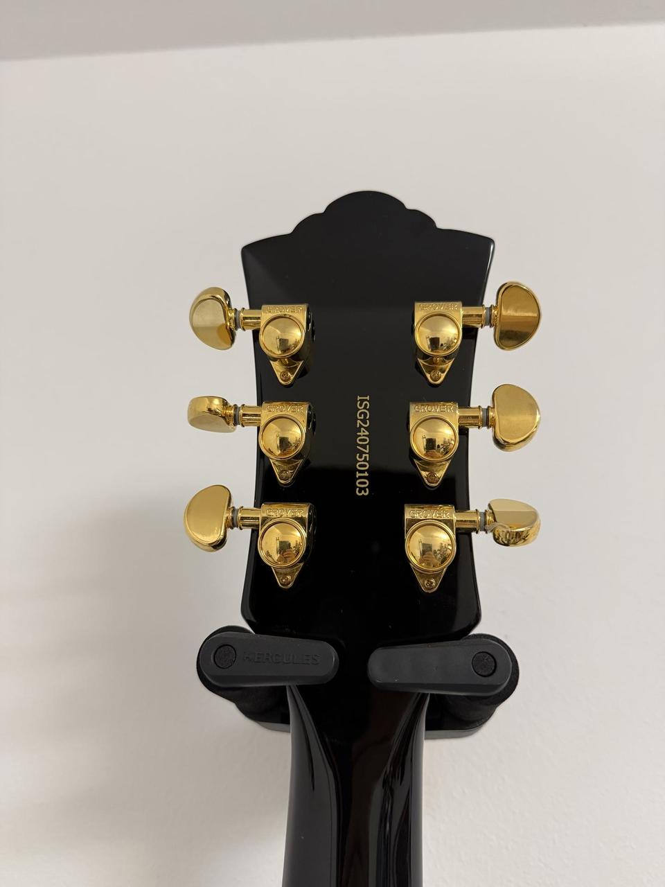 ) v černém lesku se zlatým hardwarem. Kytara je zcela nová, nehraná, bez škrábanců a bez známek použití. Specifikace: • Mahagonové tělo • Set-neck konstrukce • 2× humbucker • Tune-o-matic kobylka • Zlatý hardware • Blokové perleťové inlaye • 22 pražců