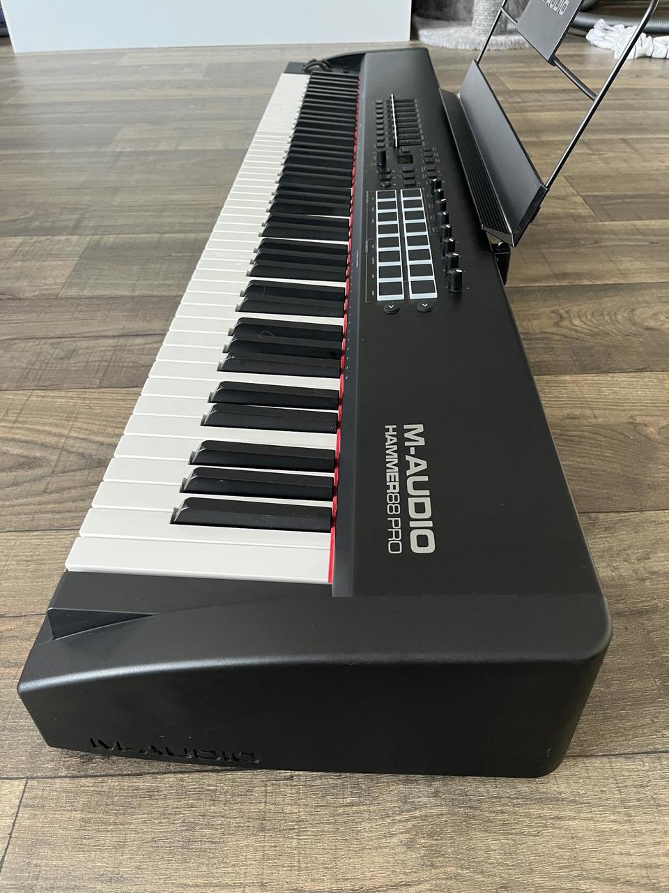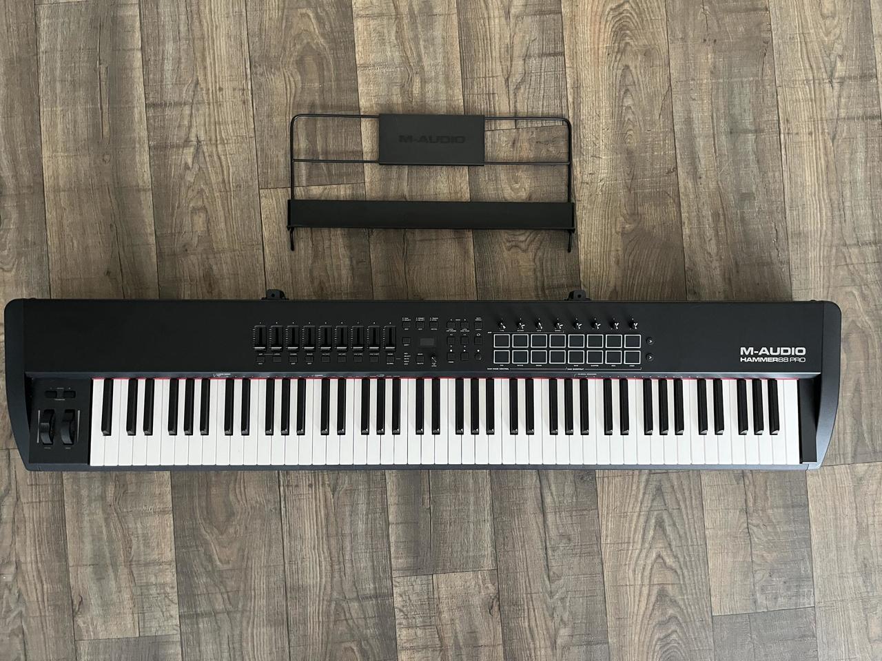 Elektronický MIDI controller s kladívkovou mechanikou. Nebyl moc hraný, takže je jako nový. Jediná věc je pár škrábanců na spodní straně (od stojanu na klávesy). Přidávám komentář od muzikeru. Předání je jinak možné ve VM, nebo v Praze osobně, případně asi i zaslat, jen jsou docela velké. Původní cena 13 690,- (Kytary.cz). M-Audio Hammer 88 Pro je plnohodnotný, 88 klávesový, USB napájený MIDI klávesový ovladač s gradovanou kladívkovou akcí, která otevírá široký svět tvořivosti! Vzhledem na zpětnou vazbu od uživatelů i umělců je nový Hammer 88 Pro vybaven jako špičkový nástroj pro studio a živá vystoupení. Dodejte svému arzenálu přirozený pocit z klavíru Hammer 88 Pro a posuňte svou hudbu na další úroveň! Díky OLED obrazovce, která je umístěna vpředu a ve středu, je jednodušší než kdykoliv předtím vyhledávat a testovat zvuky, ovládat mapování a mixovat a upravovat vaše nahrávky. Hammer 88 Pro dokáže ovládat libovolné DAW a automaticky mapovat běžně používané funkce jako jsou Transport, faders, Pan a další! Ať už používáte Pro Tools, MPC Beats, Cubase, Logic, Studio One nebo jakýkoli jiný významný DAW, stačí zvolit mapu a o ostatní se postará Auto-Mapping!