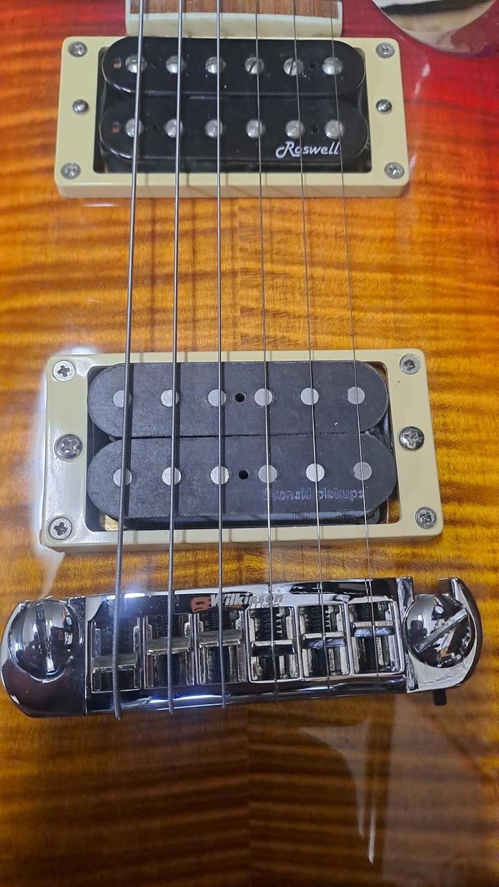 Skvělý nástroj. Kytara je z mahagonu, krk je lepený ze 3 podélně lepených kusů, takže nehrozí zlomení hlavy! Snímač u kobylky humbucker Alnico 5 od Milana Dronského, je to TOP snímač. Zamykací mechaniky s převodem 1 :18 !! Kobylka Wilkinson! Perfektně ladí a zvuk který trhá nohavice! Kobylkový snímač má přepínání na sériové /paralelní zapojení. Snímač u krku humbucker Roswell Alnico 5.