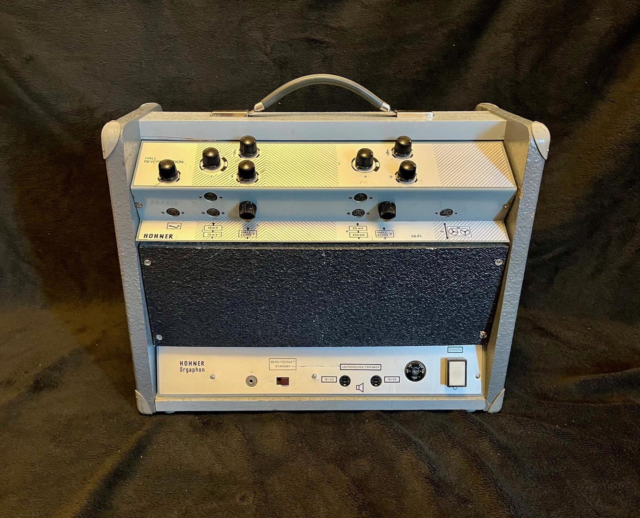 Na predaj nástrojový elektrónkový zosilňovač HOHNER. Model: ORGAPHON MH (Pružinový Hall). Výrobca: Hohner, Matthias, AG, Trossingen, GERMANY. Rok produkcie: 1964. Výkon: 15W. Elektrónky: Ecl86 (2x), Ecc808 (2x), Ecl86 pre HALL. Dva vstupy, korekcie: Bass, Treble, Volume. Originálny veľmi zachovalý a pôvodný stav. Reproduktor: originál DEW Magnetfabrik Dortmund (10´´), Made GERMANY. Vzácny zosilňovač, ktorý nie je ľahké zohnať zvlášť v takomto zachovalom a pôvodnom stave. Krásny krémový a dynamický VINTAGE zvuk ktorý pri prebudení prechádza do skreslenia. Na svoj výkon je zosilňovač dosť hlasný. Vykonaný servis (premerané a nastavené elektrónky, vyčistené potenciometre, vymenené niektoré odpory a kondenzátory, celkové vyladenie…). Vhodný pre gitaru, harmoniku, live použitie, skúšobňu a štúdio.