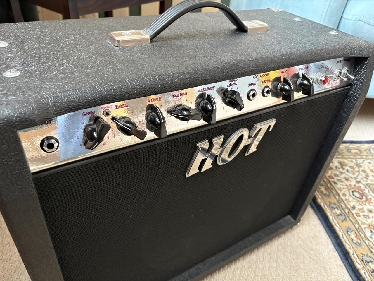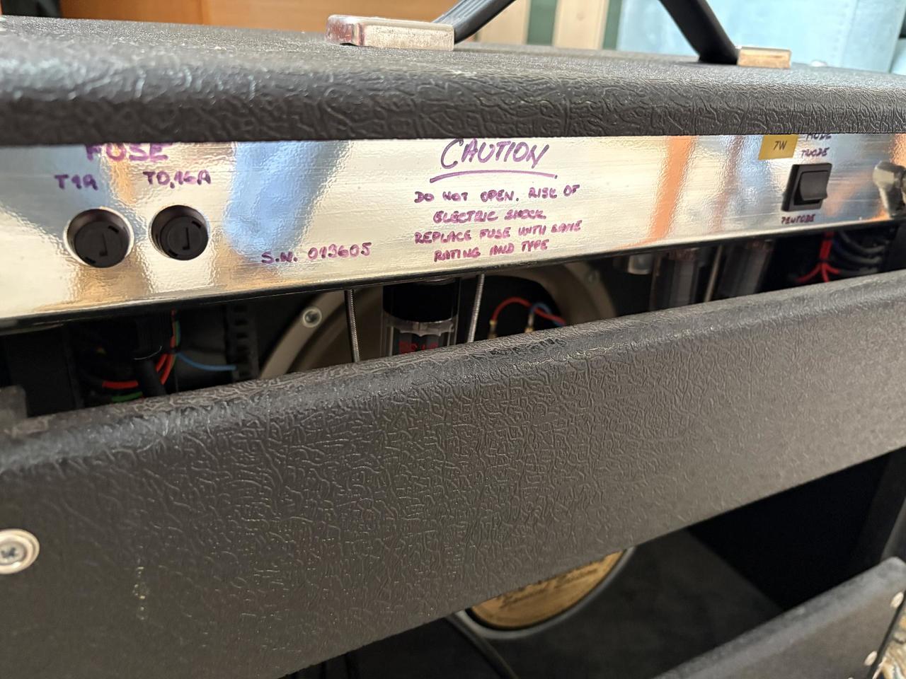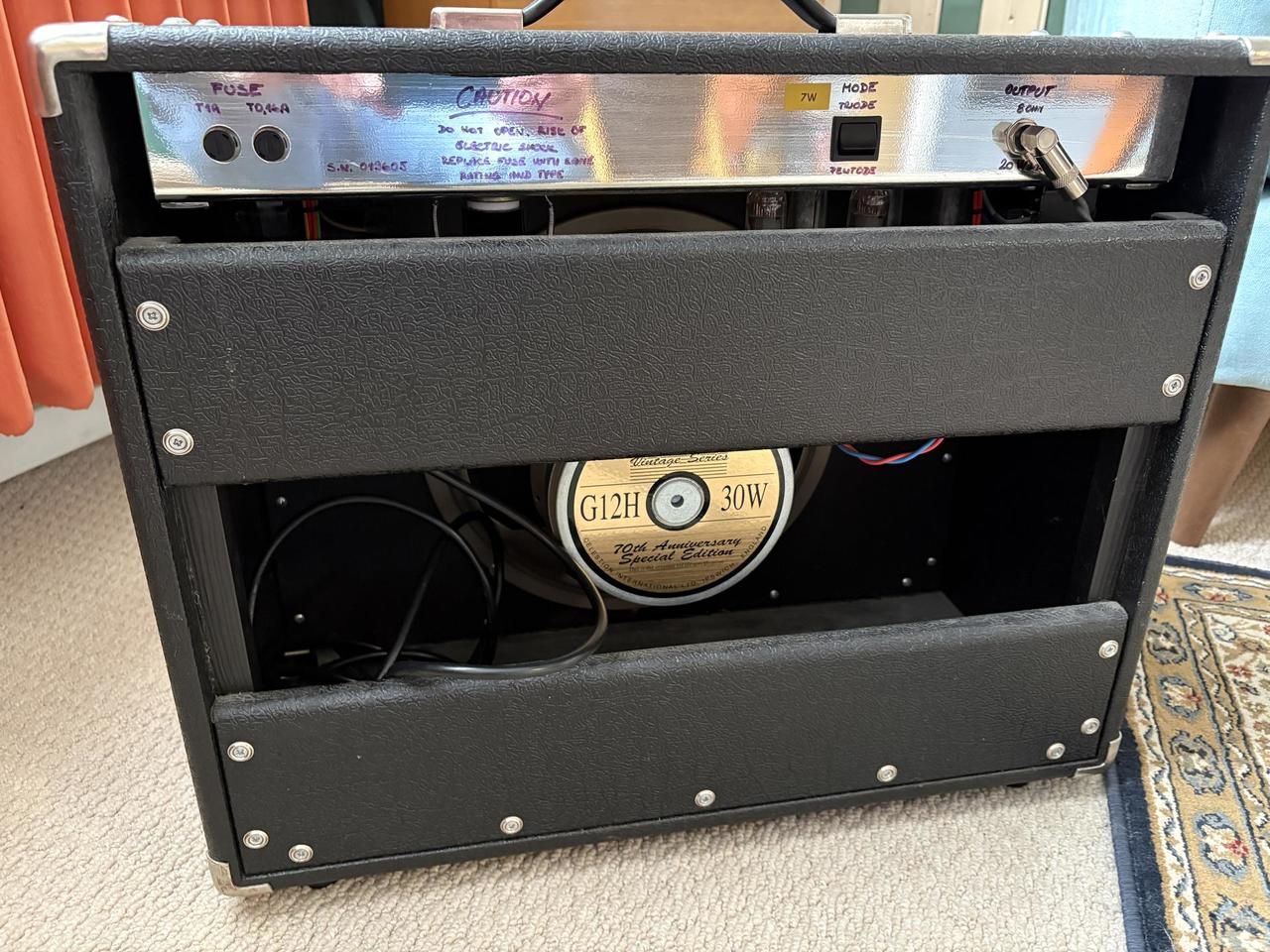 prodám trochu záhadné kombo od českého renomovaného výrobce Pavla Horkého. Jsem asi třetí majitel a moc jsem se toho o něm nedozvěděl. Podle vzhledu je to rozhodně starší kousek a síly má na rozdávání. Zvukově je to něco mezi Marshallem a Voxem. Kombo je samozřejmě hrané, takže sem tam nějaký škrábanec, ale jinak v dobré kondici. Jedná se o precizní práci a celý obvod je samozřejmě ručně pájený. Reproduktor je výroční Celestion Vintage Series. Při rychlém jednání možná sleva