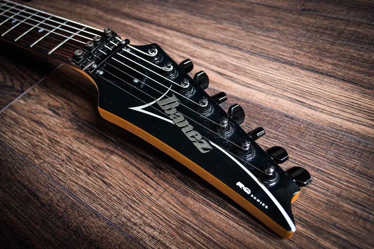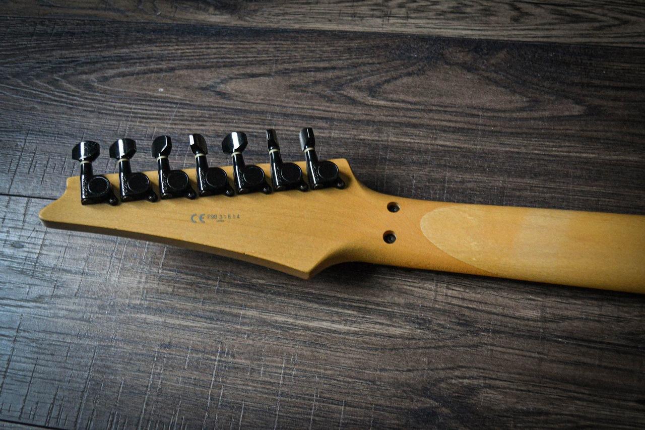 Často se jí říká Universe pro chudé :-) Kytara je ve velmi slušném stavu. Samozřejmě už není nejmladší, takže se na ní najde několik ťukanců a škrábanců. Především na zadní straně. Ale není to nic vážného. Hmatník a pražce jsou ve velmi pěkném stavu. Kytara má nový přepínač snímačů. Součástí je pevný kufr Ibanez a tremolo páka. V případě zájmu můžu zaslat víc fotek. Model name: RG7620 / RG7-620 Body type: Solid body Body material: Basswood Neck joint: AANJ Bridge: Lo Pro Edge 7 Neck type: RG7 Neck material: 1-piece maple Fingerboard material: Rosewood Fingerboard inlays: Pearl dot Frets: 24 / jumbo Machine heads: Gotoh SG38 Pickup configuration: HH Bridge pickup: DiMarzio RG-7-B (H) Neck pickup: DiMarzio RG-7-N (H)