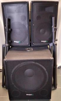 Aktivní ozvučovací set. Set je složen z aktivního subwooferu, dvou pasivních reprosoustav, stojanů. Satelitní reprosoustavy jsou zapojeny paralelně (mono). 18" aktivní subwoofer: - vestavěný 2-kanálový zesilovač MAX: 1200W - Frekvenční rozsah: 20 - 180 Hz - výstup na satelity (SPEAKON) 2x pasivní 3-pásmová reprosoustava: - s 12" basovým reproduktorem - příkon MAX 600W - Frekvenční rozsah: 40 - 20000 Hz - impedance: 8 ohm - rozměry: 370x605x310mm - hmotnost: 10,2 kg