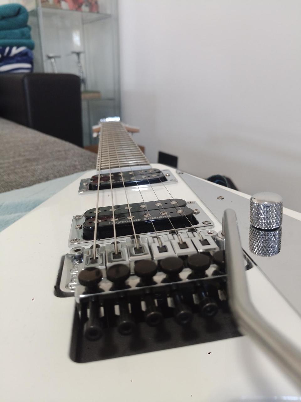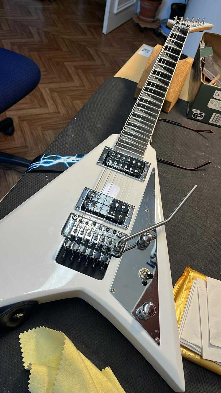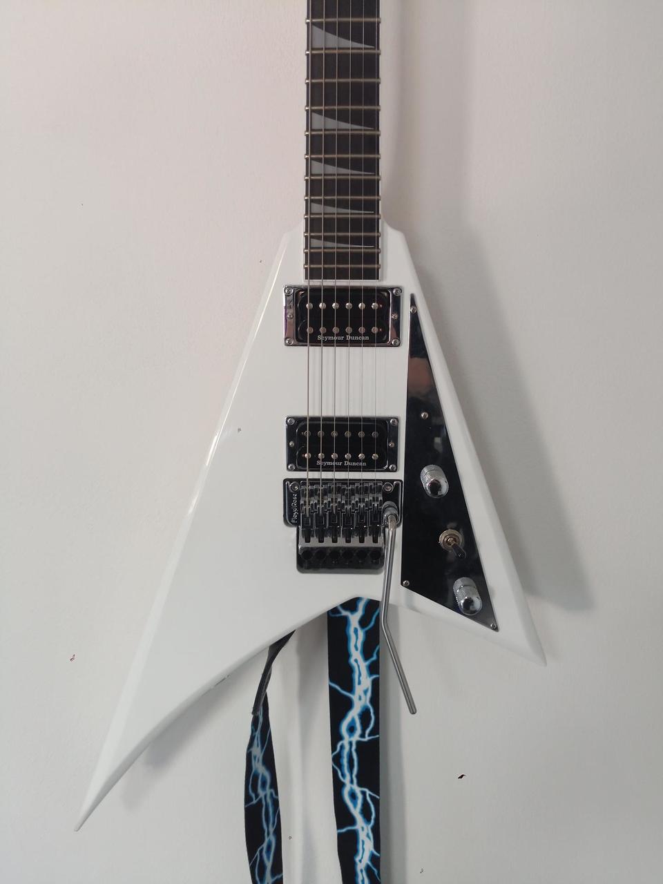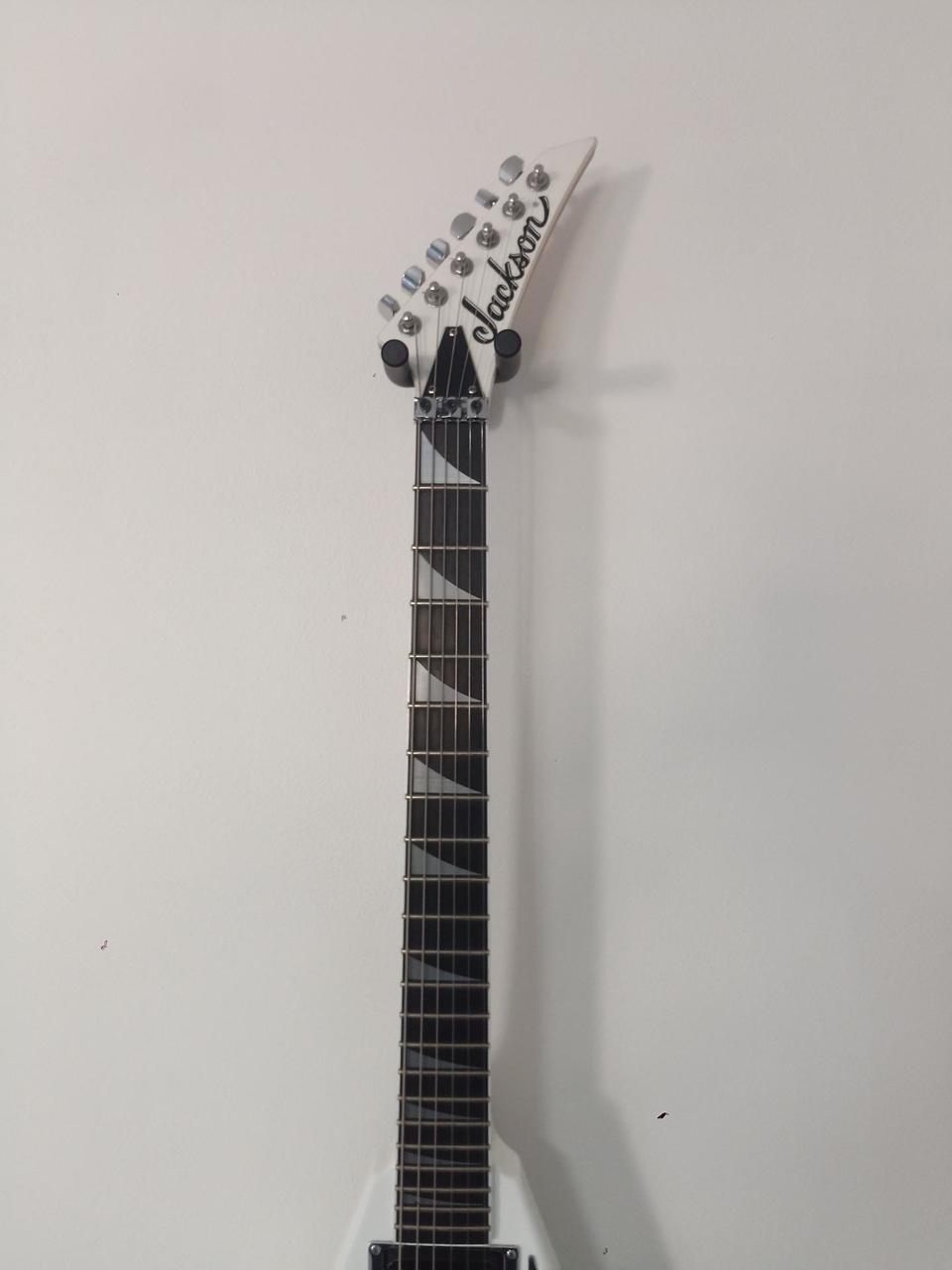 Nevyužitý Jackson kterého jsem nechal hezký seřídit dvě vady na kráse.elektrtrická kytara Historie firmy Jackson sahá až do roku 1970 a protíná se s turbulentním nástupem tvrdých hudebních stylů s kořeny v metalu. Metaloví hráči si tyto nástroje okamžitě vzali za své a do dneška jsou kytary Jackson určeny především pro ně. Svůj podíl na tom má i legendární kytarista Randy Rhoads (Ozzy Osbourne), který s návrháři firmy Jackson začátkem osmdesátých let na papírový ubrousek nakreslil návrh kytary Concorde a navždy tak redefinoval zvuk metalové kytary. Kytary Jackson ze série PRO jsou nástroje, které charakterizuje použití prémiových materiálů, důmyslné zpracování a kvalitní komponenty, díky kterým je požitek ze hry opravdu unikátní. Model této kytary odpovídá specifikacemi i tvarem kytaře legendárního Randyho Rhoadse a proto by neměl ujít vaší pozornosti. Tělo této kytary je vyrobeno z mahagonového dřeva a je opatřeno lesklým, polyurethanovým lakem. Jednovrstvý javorový krk s grafitovým zpevněním výztuhy prochází tělem, což mu zajišťuje skvělou hratelnost a delší výdrž tónu. Skvěle se hodí pro rychlou hru. Té je přizpůsoben i ebenový hmatník, jehož rádius je kombinovaný a směrem k tělu se zplošťuje. Najdeme na něm 22 pražců velikosti Jumbo. K orientaci na hmatníku slouží typické žraločí ploutve. Menzura nástroje odpovídá rozměru 648 mm. Šířka nultého pražce je 43 mm. Struny jsou ukotveny v dvojzvratném Floyd Rose tremolu s dvěma zámky, k ladění slouží chromované Jackson Die-Cast ladící mechaniky. Samozřejmostí je zámek nultého pražce. Toto vše znamená, že vaše kytara zůstane perfektně naladěná, ať už se rozhodnete s ní dělat cokoliv. O snímání zvuku se stará osvědčená kombinace dvou humbuckerů, v tomto případě se navíc jedná o snímače renomované firmy Seymour-Duncan. Přepínat mezi nimi lze pomocí třípolohového switche, k dalšímu tvarování tónu slouží ovladače hlasitosti a tónové clony. Jackson PRO RHOADS RR by neměla uniknout nikomu, kdo to s hraním myslí zcela vážně.
