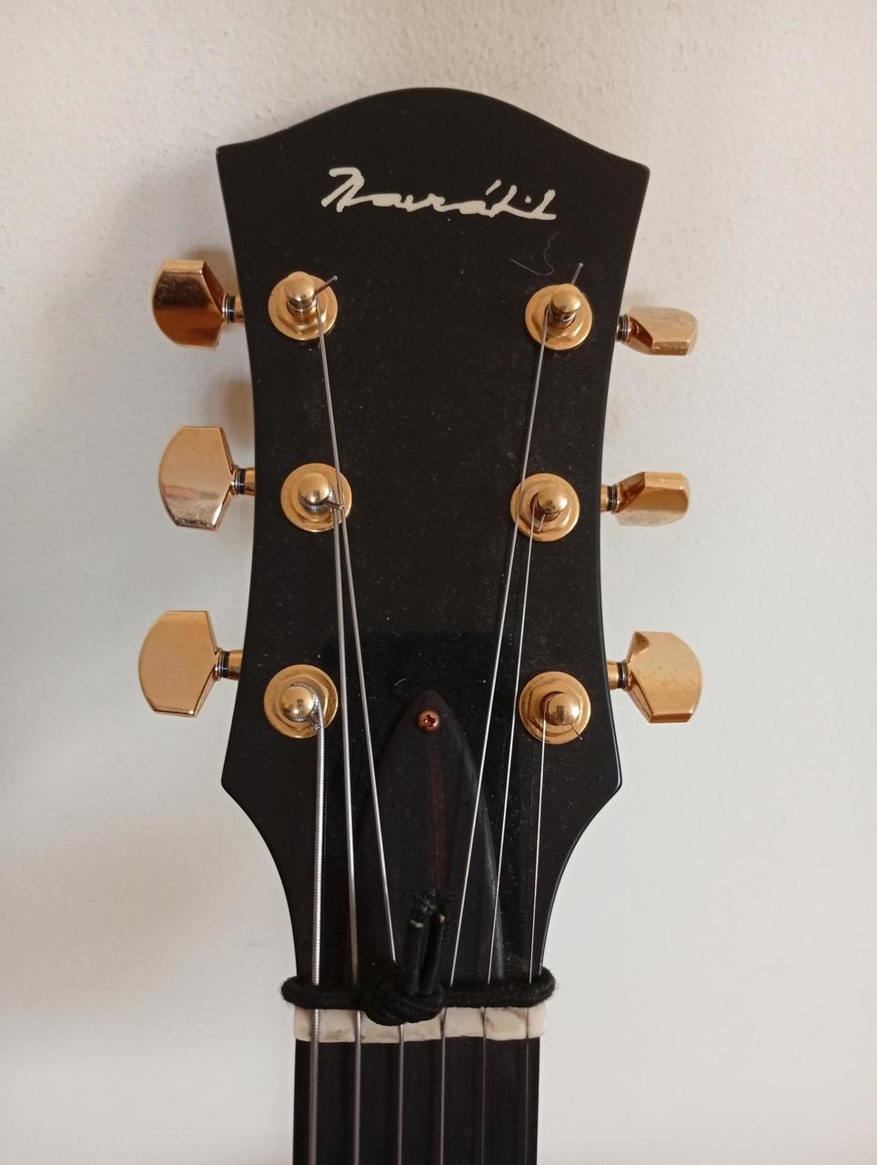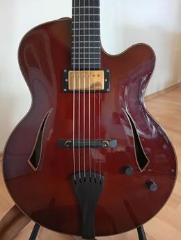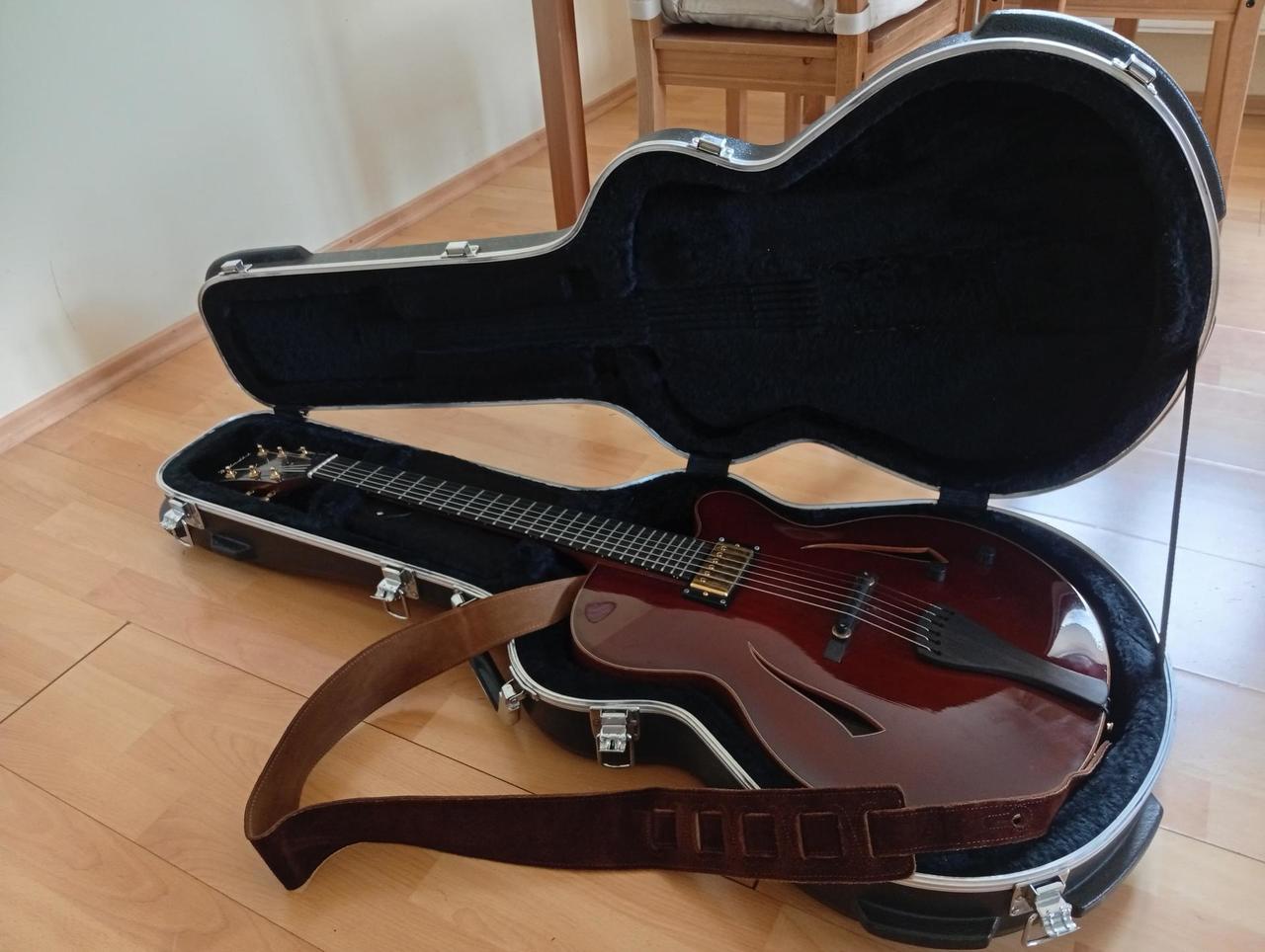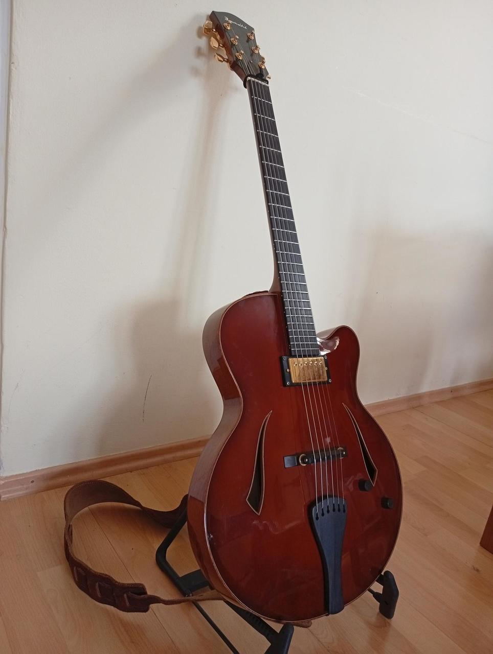 Prodám nebo vyměním luxusní celomasivní jazzovou kytaru od skvělého kytaráře Jiřího Navrátila (Sagitarius). Vrchní deska dlabaný smrk, luby a zadní deska a krk mahagon, hmatník eben. Kytara má zcela netypicky 24 pražců, je skvěle hratelná a má v celém rozsahu pevný, jasný, přitom jazzově zabarvený kulatý zvuk. Je to klasická žebrová konstrukce, žádný sustain block, přitom díky malému tělu nechytá vazbu ani při velkém zesílení. Snímač Gibson 57, mechaniky Gotoh. Skvělý nástroj na jazz, be-bop, fussion, blues a všude tam, kde potřebujete průrazný, ale kulatý, jasně artikulovaný zvuk. Struny používám 0.13, přesto je dohmat pohodlný a měkký. Fakt zajímavý kus!