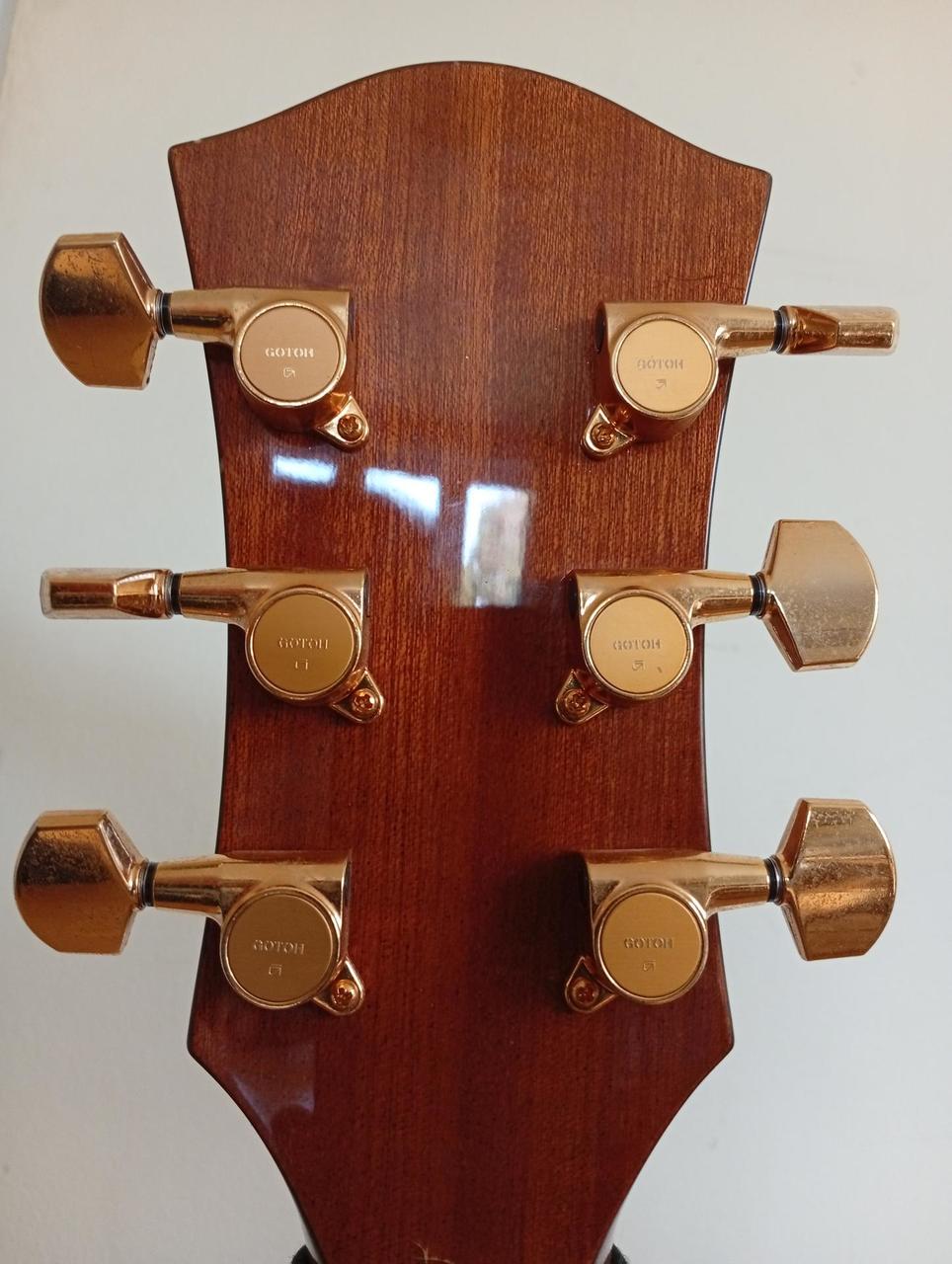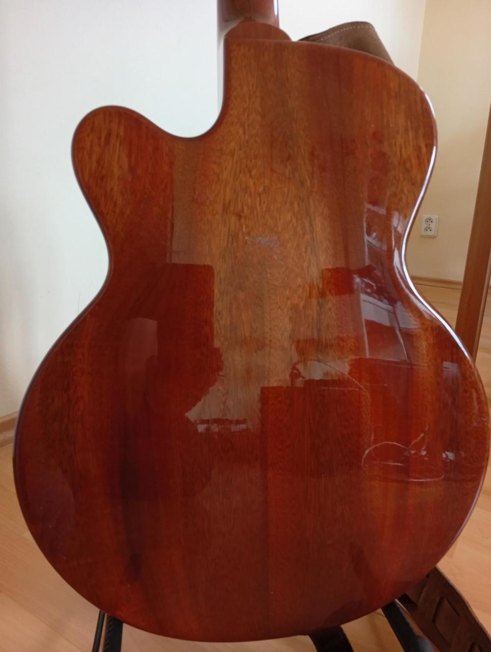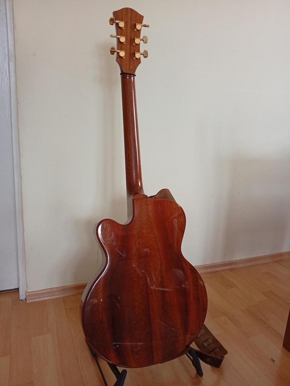 Prodám nebo vyměním luxusní celomasivní jazzovou kytaru od skvělého kytaráře Jiřího Navrátila (Sagitarius). Vrchní deska dlabaný smrk, luby a zadní deska a krk mahagon, hmatník eben. Kytara má zcela netypicky 24 pražců, je skvěle hratelná a má v celém rozsahu pevný, jasný, přitom jazzově zabarvený kulatý zvuk. Je to klasická žebrová konstrukce, žádný sustain block, přitom díky malému tělu nechytá vazbu ani při velkém zesílení. Snímač Gibson 57, mechaniky Gotoh. Skvělý nástroj na jazz, be-bop, fussion, blues a všude tam, kde potřebujete průrazný, ale kulatý, jasně artikulovaný zvuk. Struny používám 0.13, přesto je dohmat pohodlný a měkký. Fakt zajímavý kus!