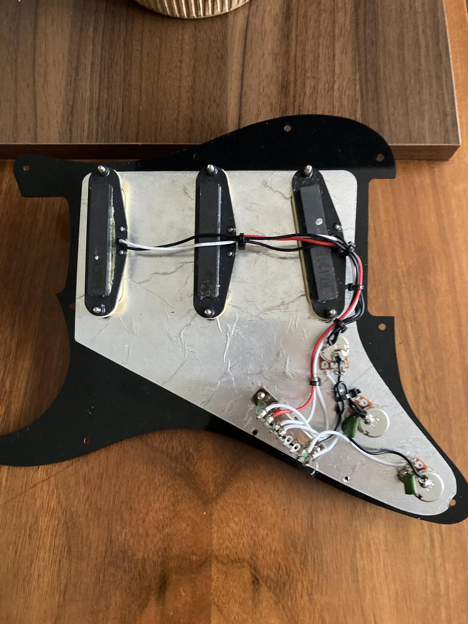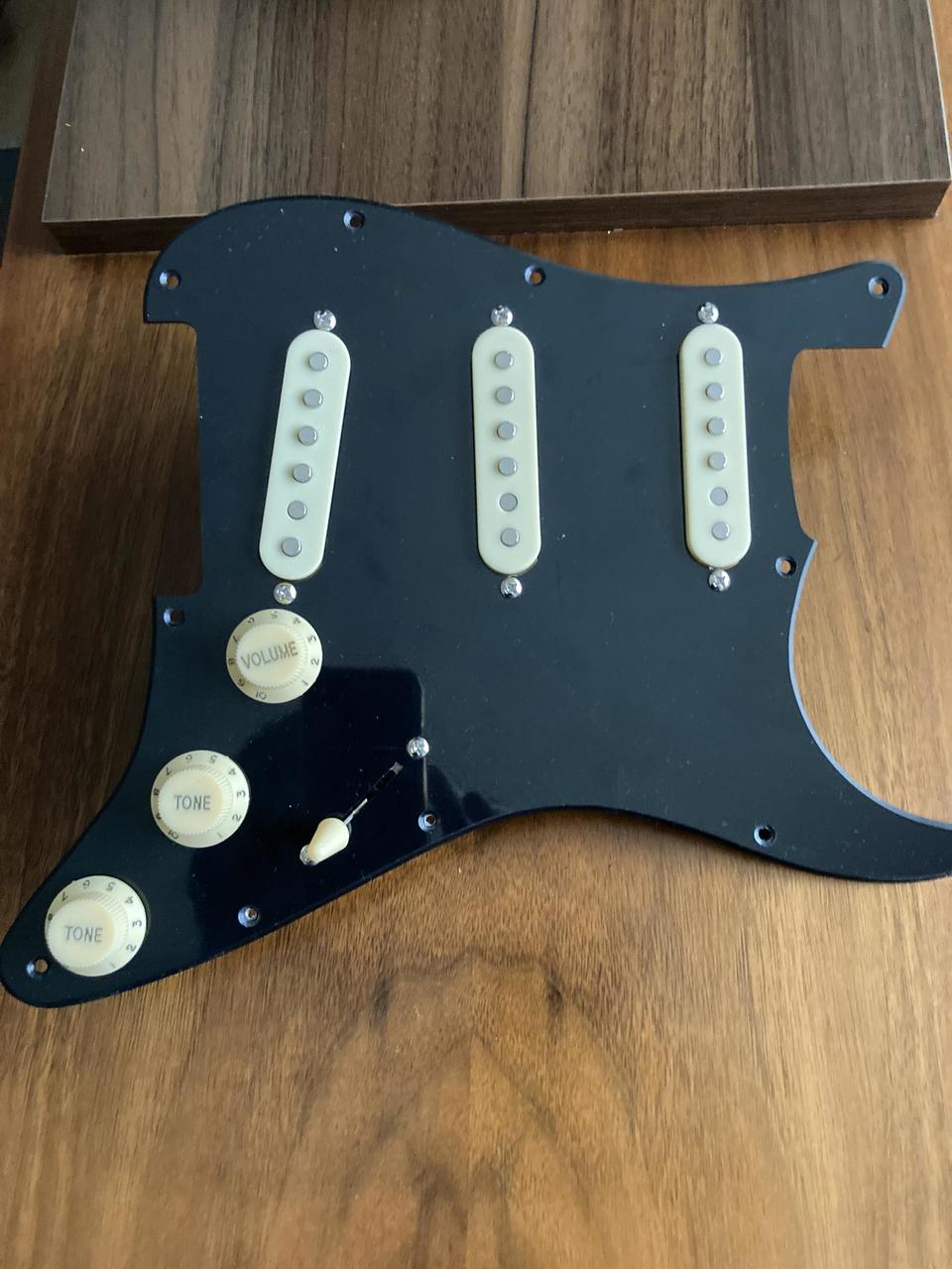 Komplet zapojená elektronika na jednovrstvém picquardu z nové kytary Jet js-300 typ stratocaster. Snímače nezní špatně, 5.6-5.9kOhm, pěkný ,,twang" zcela určitě lepší než Squier. Přepínač, potenciometry i snímače shodné značky CF.
