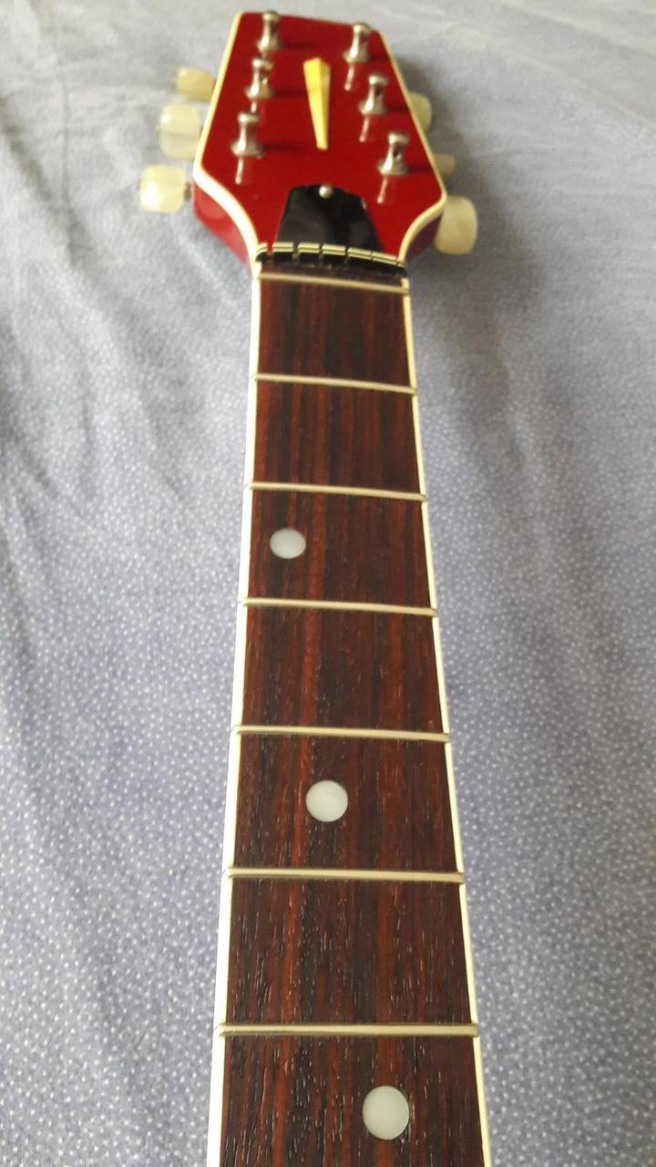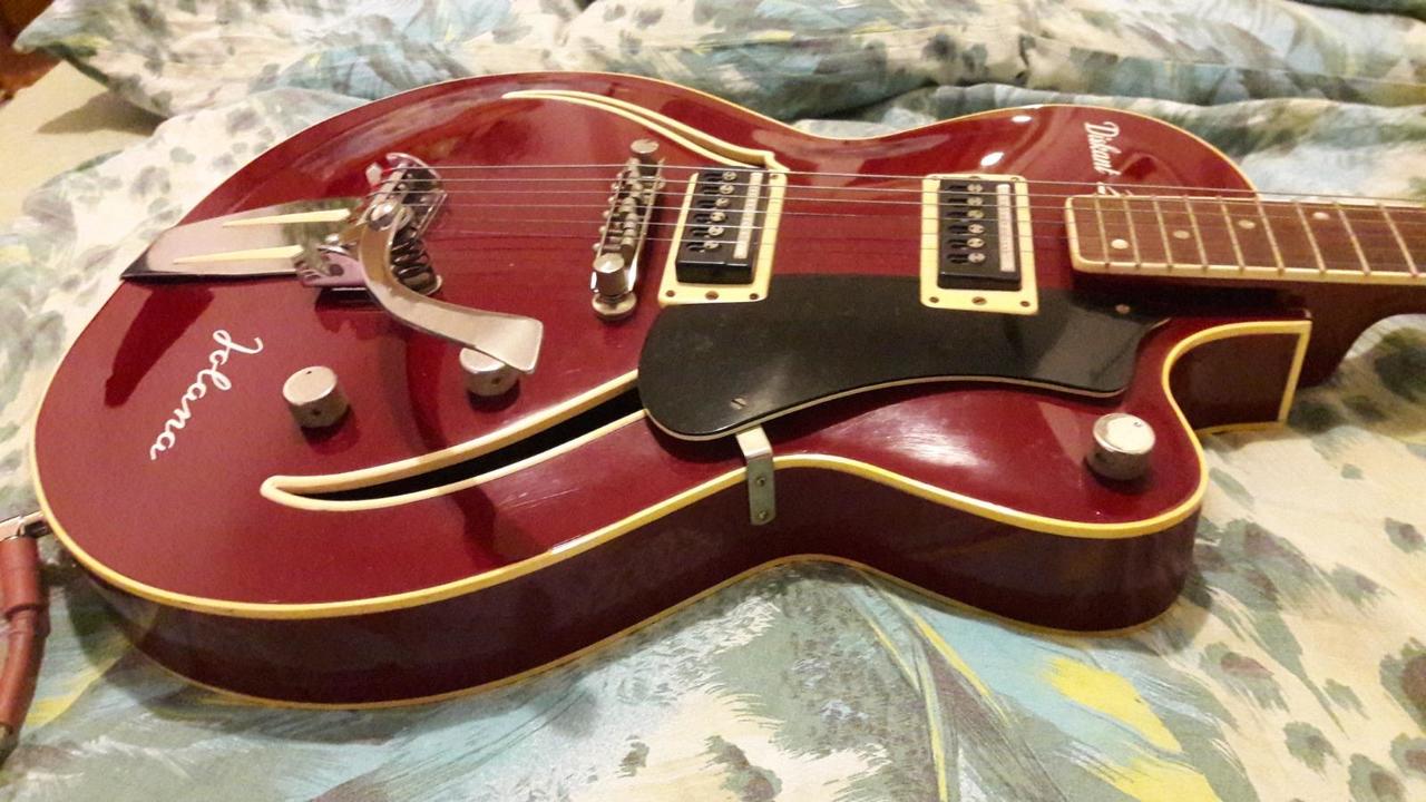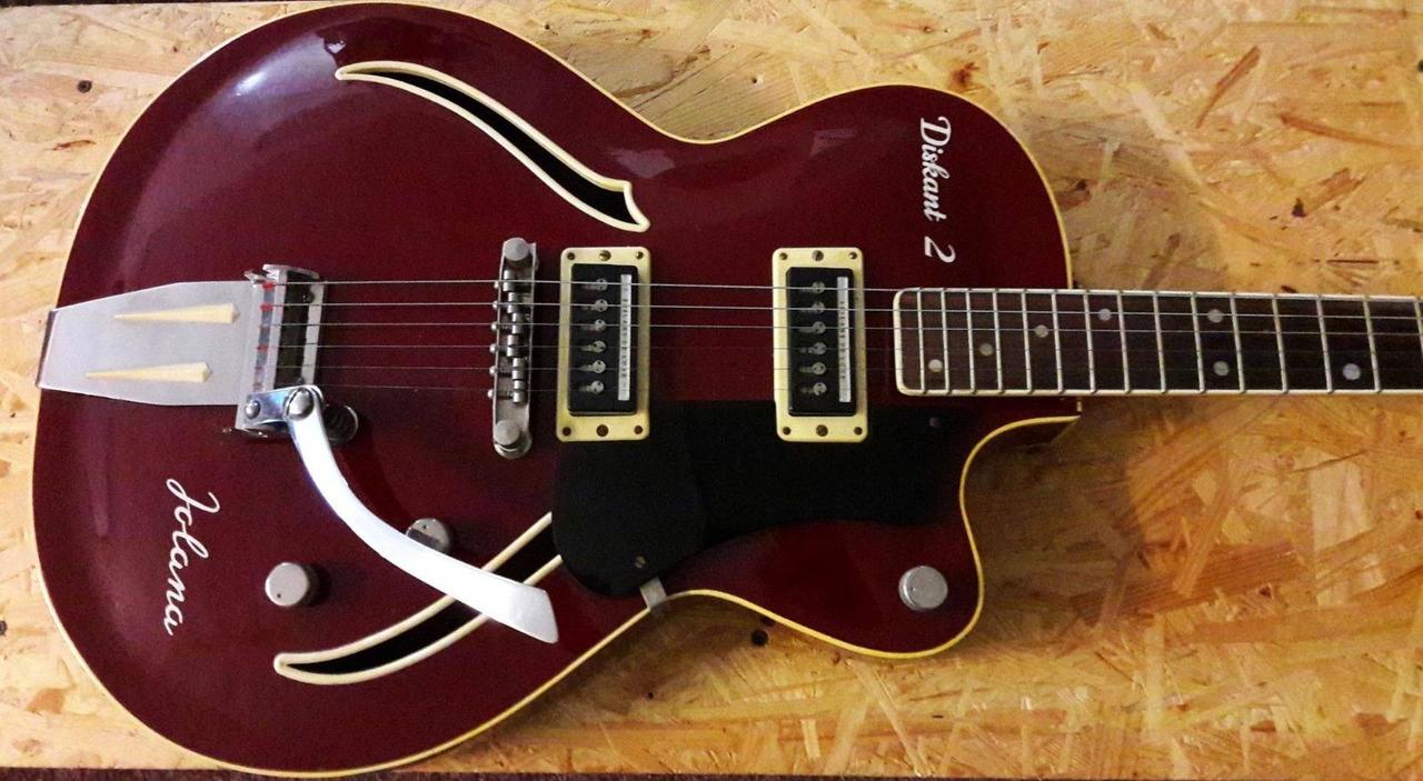 Jolana Diskant 2 z roku 1965. Vyrobená v Hradci Králové. Bylo vyrobeno jen 300 kusů tohoto modelu. Popsal bych ji jako téměř tovární stav. Výjimečně nízké sériové číslo 003. Všechno funguje, drží ladění. Má hmatník z brazilského palisandru, což jsem na Jolaně nikdy neviděl. Byl to nejvyšší model Jolany. Mám k ní samozřejmě originální pouzdro. Je to pravděpodobně jediný kompletní exemplář (včetně paki tremolo a dekoračních plastu na hardware) v České republice. V referenční knize "Od Graziosa k Diamantce" je uvedena nekompletní kytara.