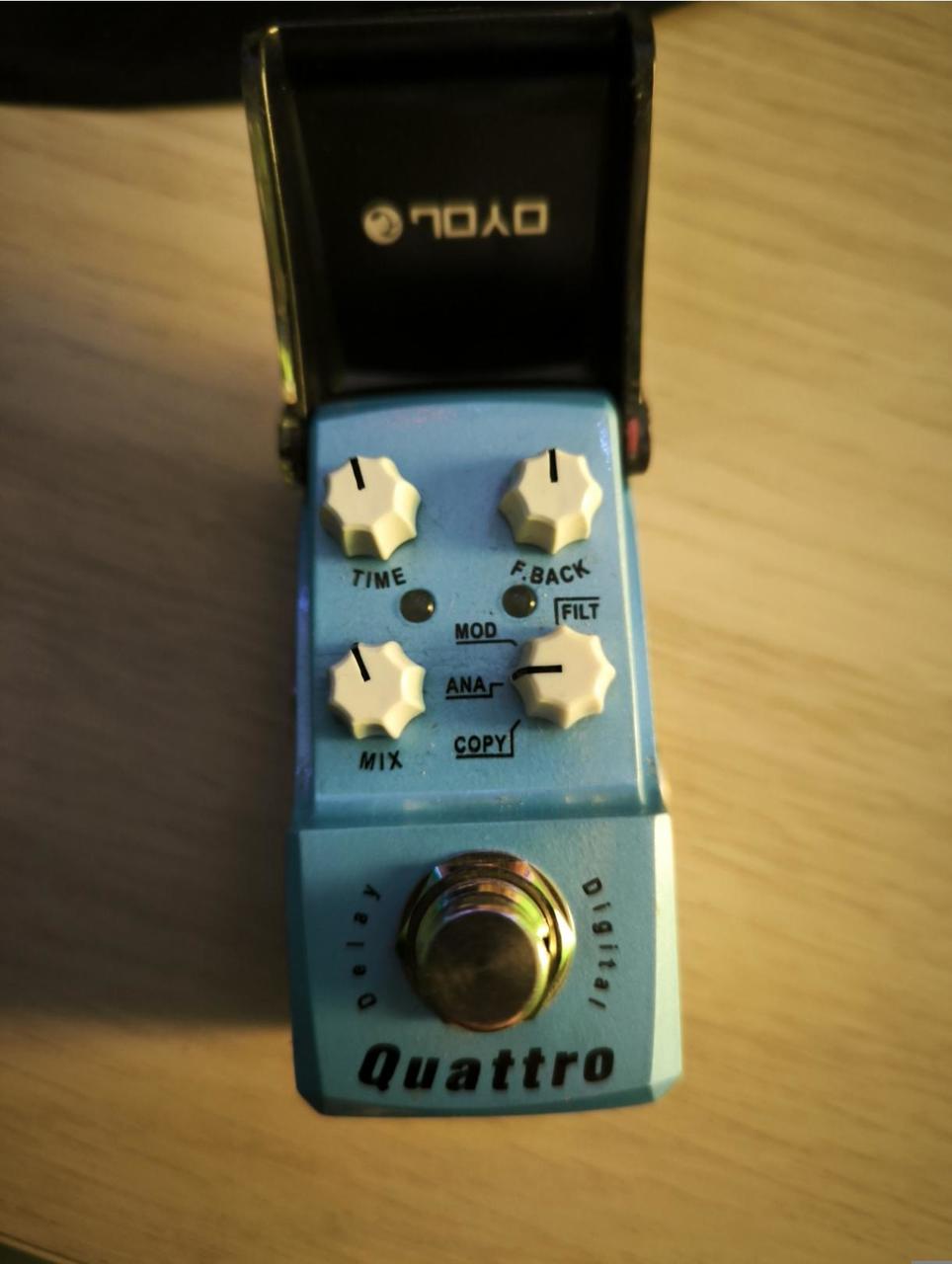 Prodávám pedal Joyo JF-318 Quattro je digitální delay, který v ultra kompaktní verzi nabízí čtyři zvuky (režimy) tohoto efektu – Copy (klasický digitální delay), Analog (simulace analogových BBD efektů), Modulation (s přidaným efektem Chorus) a Filtered (LFO filter), s maximálním zpožděním (delay time) 958 ms. Za málo peněz a minimum prostoru v pedalboardu tak získáte široké spektrum delay zvuků a jejich nastavení. Zbylé ovladače určují poměr dry/wet signálu, počet opakování a délku trvání delay efektu. Krabička funguje v režimu true bypass, takže ve vypnutém stavu nijak neovlivňuje průchozí signál. K napájení slouží 9V adaptér.