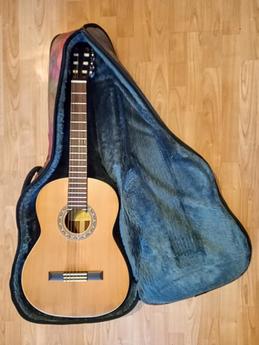 Klasická kytara s nylon strunami vel. 4/4. Hraná jen doma, minimální známky použití, slušný zvuk. Plus polstrovaný obal viz foto.
