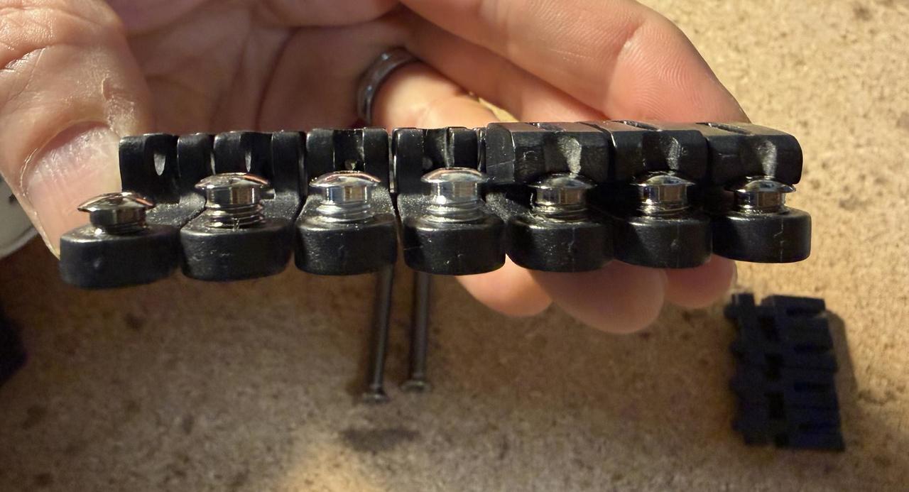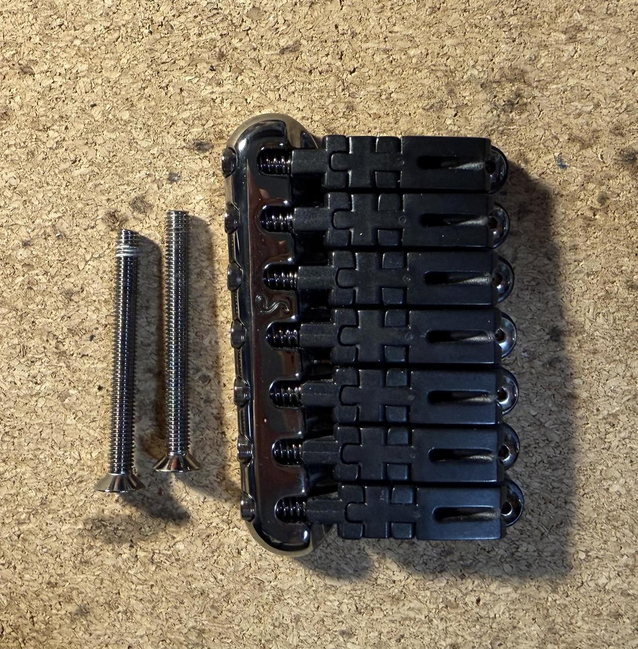 Prodám sedmistrunnou kobylku Schaller Hannes 7 v barvě niklové (struny skrz tělo). Původní cena asi 5000. Stav 100%. Skládá se ze dvou šroubů, základny a nastavitelných sedel. Jejich výška se nastavuje šrouby pod sedly. Cena je včetně případného poštovného - ideálně Zásilkovna.