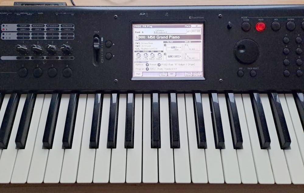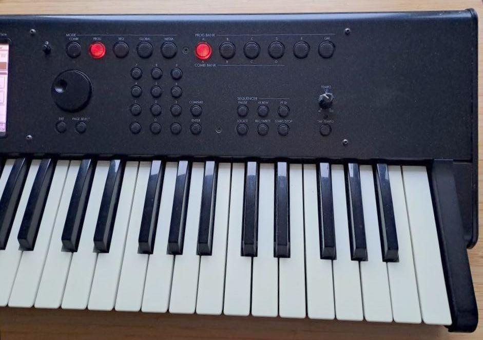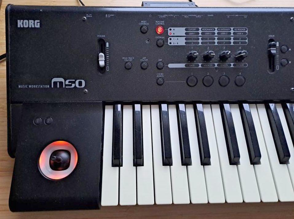 Korg M-50 - (61) všechny klávesy funkční, dotykový displej funkční, tlačítka funkční (kromě jednoho nepodstatného - chord memory), levý linkový výstup funkční, ale pravý nefunguje, sluchátkový výstup je funkční v obou kanálech, přes DI box bez problémů stereo, s originálním zdrojem. Poslední generace před Kronosem.