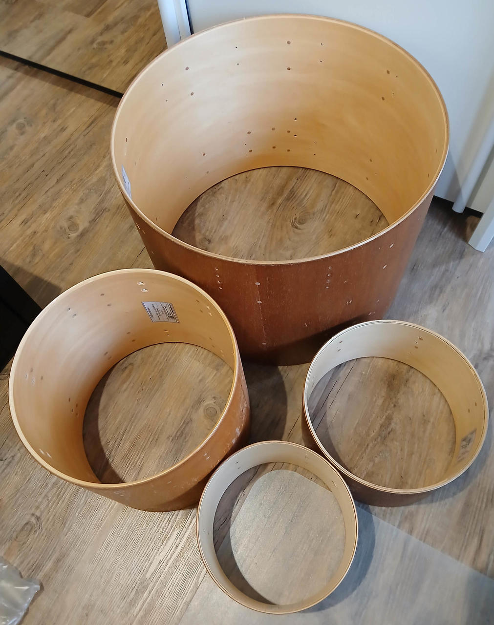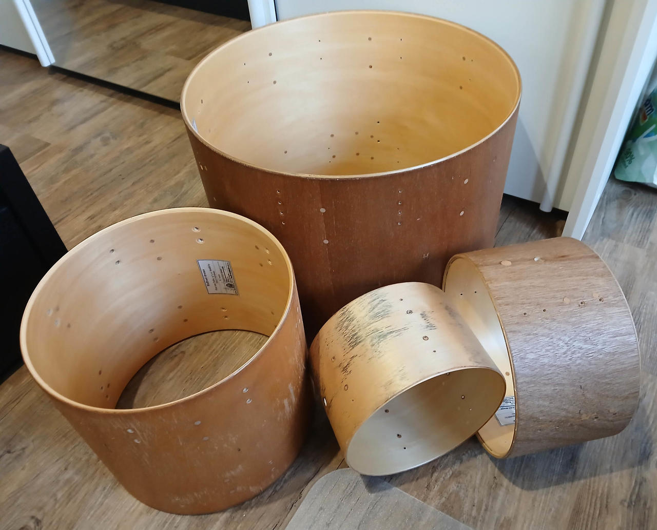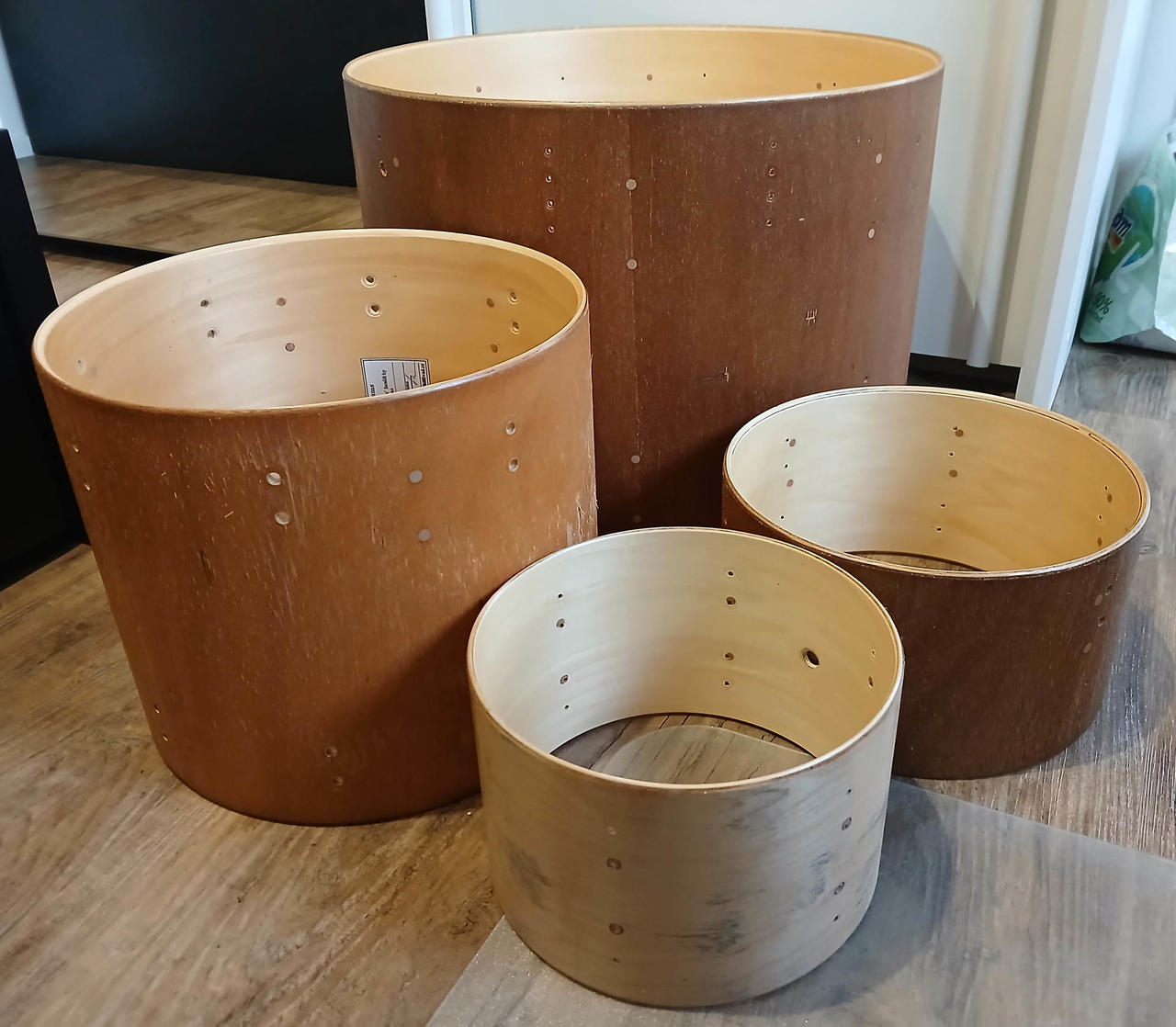 Původně prošly dílnou Hallvad pana Vágnera. Na korpusech byl nalepený potisk - po strhnutí je na ploše ještě lepidlo a menší otřepy - to by bylo potřeba upravit. Doporučuji spíše pro nadšence, který si chce postavit set na experimentovaní apod. Bicí mám zabalené v krabici, takže mohu i odeslat kurýrem.