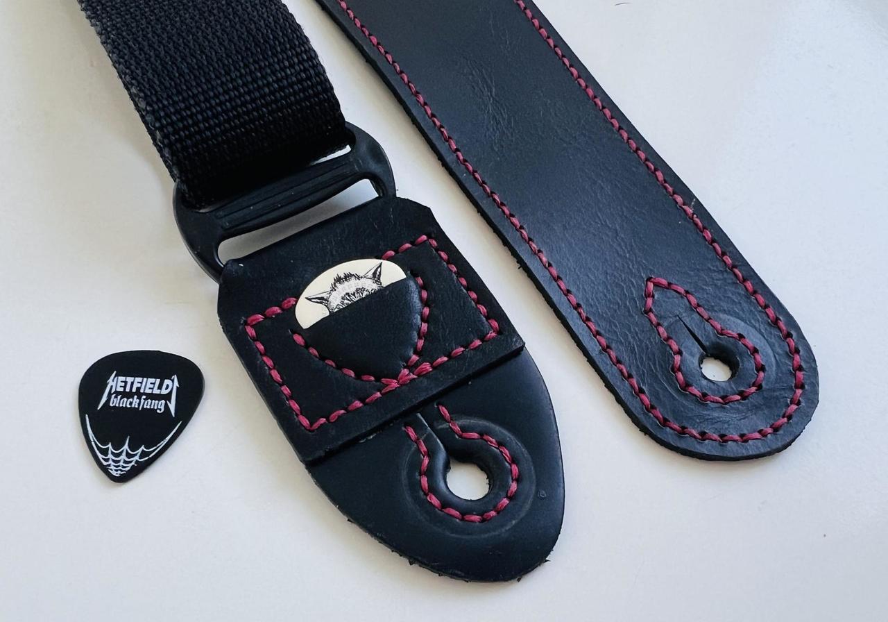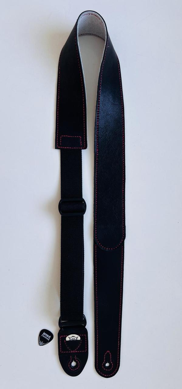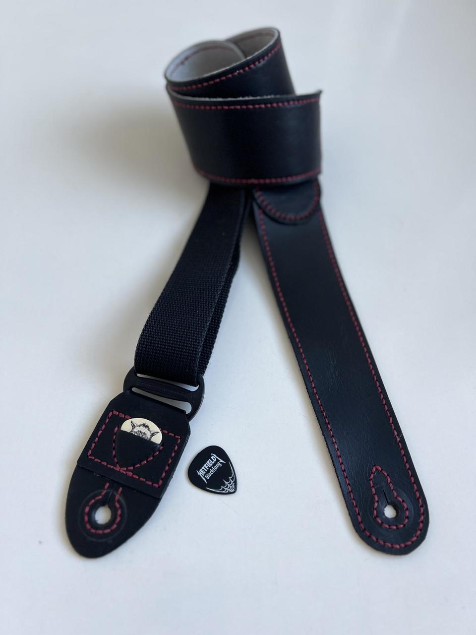 Pohodlný a pevný kytarový řemen z kůže Crazy Horse, červeně prošitý ze dvou vrstev. Rozměry 60mm x 1140-1400mm