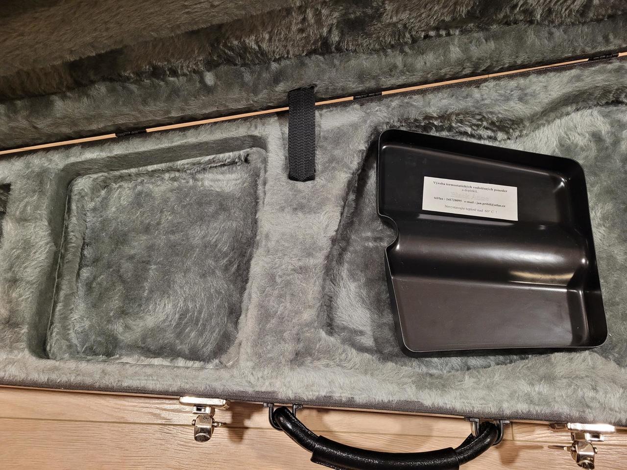 Prodávám jej, protože je naprosto ideální pro kytaristu, který pravidelně vystupuje a potřebuje nástroj v maximálně bytelném kufru. Já nejsem aktivní mimo obývací pokoj, je jej tedy pro mě škoda. Vnitřní tvar je univerzální (LP, Strat, SG atd., Flying V a Explorer jsou mimo hru). Kufr se pyšní termostatikou – díky izolaci zachovává stabilní vnitřní prostředí. Další vlastností je reálná vodotěsnost, kterou zajišťuje unikátní povrch v lemu, který se po uzavření zcela semkne. Hmotnost je poctivých 4 850 g (mnou zváženo). Kufr je vyroben ze skořepin z kompozitu ABS a TPU, což spojuje extrémní odolnost proti nárazům a schopnost tlumit vibrace. Skořepina nevykazuje žádnou kroutivost ani náznak na promáčknutí. Na celém kufru není dodnes jediný škrábanec. Na třech stranách se nachází celkem 12 plastových nožiček (vždy po 4 ks) – kufr díky nim stabilně stojí na výšku, leží, nebo stojí na boku bez přímého kontaktu s povrchem. Uvnitř je schrána na nezbytnosti. Uzávěry (4 ks) i panty (4 ks) mají prémiový, pevný chod bez vůlí a jsou jedinečné konstrukce. Masivní kožené ucho nemá jediný škrábanec. Stav je 9/10, téměř jako nový. Chybí klíče a některé nožičky jsou lehce obroušené (malichernost). Vnitřek nemá žádný zápach ani vůni, je naprosto inertní a čistý. Jde o jedinečný kytarový trezor tuzemské výroby. Zaslání v ceně, nebo vyzkoušení v Brně.