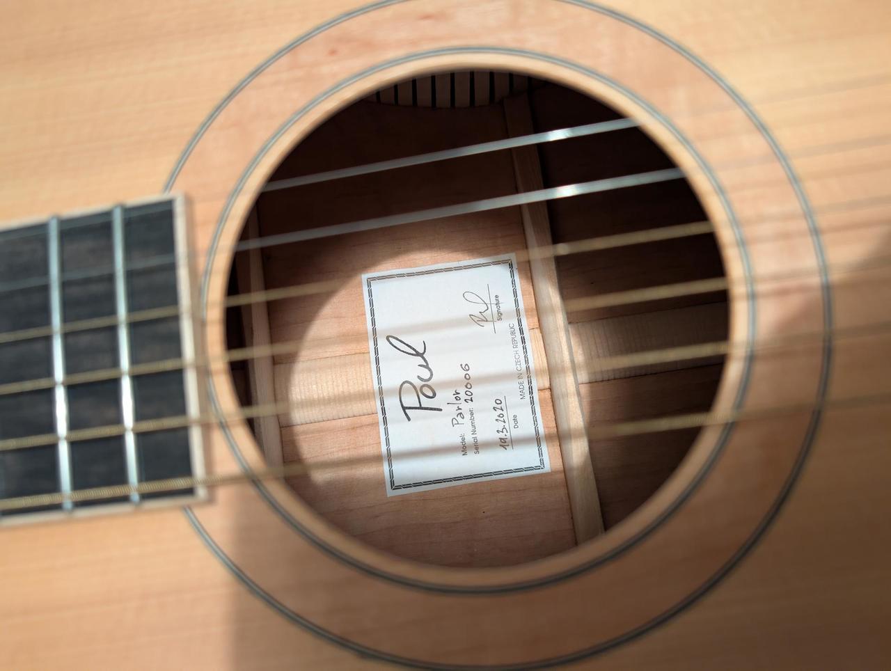 Velmi pěkná akustická kytara čekého výrobce Poul včetně tvrdého futrálu. Vyrobena v roce 2020, bez snímače. Žádné modifikace ani opravy. Kompletní specifikace viz přiložené fotky a odkaz na FB výrobce.