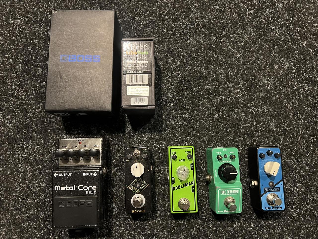 Tonecity Nobleman overdrive - 700,- Ibanez tubescreamer mini - 1300,- Moer Echoverb - 900,- Valeton Coral mod 2 - 800,-