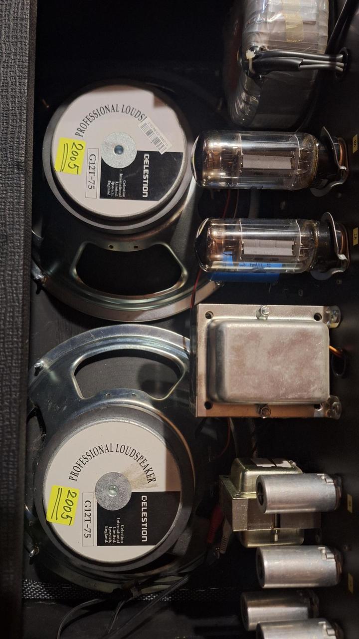 Originál footswitch (nožní spínač) Kombo má reproduktory Celestion G12T-75. (Rocková klasika zvuk je famózní) Elektronky výkonové 2x 6L6GC. V předzesiku zlatá JJ ECC83 - vstupní lampa. Pružinový dozvuk je originál. (Nezávislé nastavení pro každý kanál). Efektová smyčka. (Bypass, insert, side) - lze ji použít např. I jako mezistupeň k jemnějšímu ovládání výkonu (např. při blbnutí s kytarou doma). Instaloval jsem kolečka pro snažší manipulaci (původní nohy/gumy přidám). Minulý majitel měl z boku úchyty (je tam stopa po otlaku a otvor po vrutu). Končím s hobby (bavily mě "lampáky"). Už mi stačí 1W hlava do obýváku....