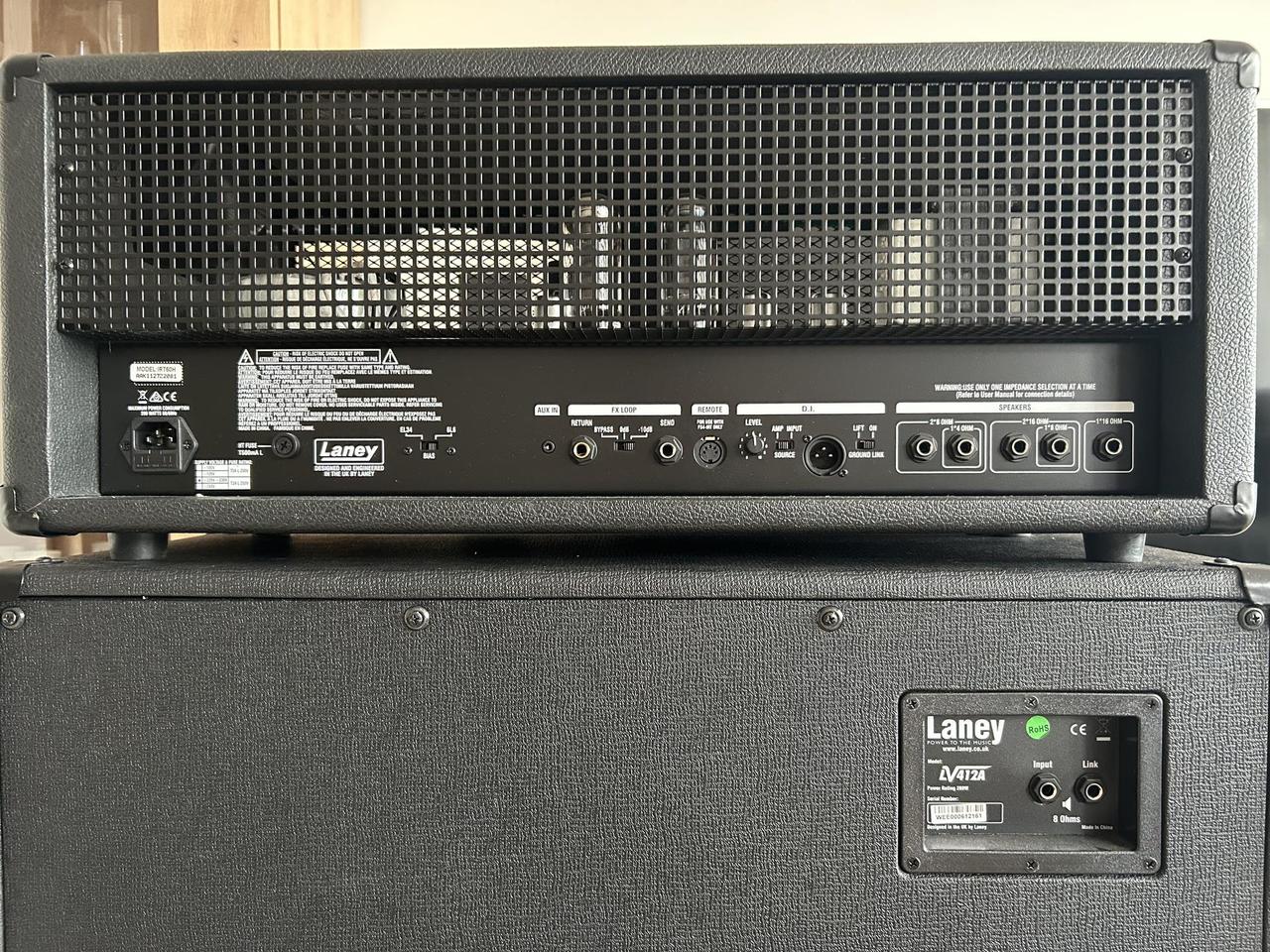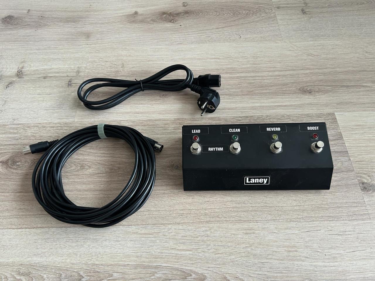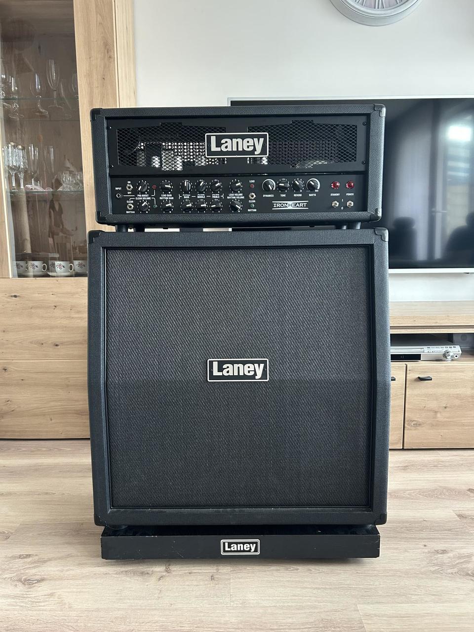 Prodám celolampový kytarový zesilovač Laney IRT60H a reprobox Laney LV412A. Zesilovač má výkon 60W, který je možné snížit dle potřeb pomocí potencionetru Watts, dále má 3 kanály - Lead, Rhythm a Clean, z nichž každý má svůj potenciometr pro ovládaní hlasitosti, ekvalizér je pro Lead samostatný, Rhythm a Clean mají společný. V zadní části se nachází vstup pro napájení, footswitch a efektovou smyčku, také výstupy pro zapojení repoboxu a pro zvučení přes linku. Set vlastním cca 2 roky. Vše je plně funkční, v pěkném stavu a bez nějakých velkých otlučenin a škrábanců. Reprobox má výkon 200W, impedanci 8Ω a je osazen čtyřmi 12” reproduktory Celestion Rocket 50. Součástí aparátu je napájecí kabel, originální footswitch Laney FS4 s propojovacím kabelem a také doma vyrobená podložka na kolečkách. Cena je za celý set. Prodávám z důvodu přechodu na kombo.