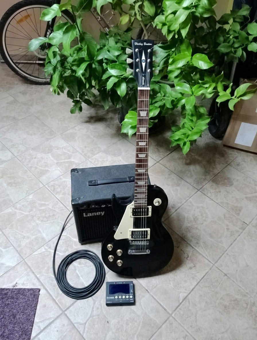 Dobrý den, prodám kompletní výbavu pro levorukého kytaristu. Kytara je téměř nehraná, sloužila spíše jako nevyužitý dar, takže pražce i lak jsou v dobrém stavu. Set obsahuje: 1. Elektrická kytara Harley Benton (typ Les Paul) LH: Černý lesk, levoruké provedení. Téměř netknutý nástroj. . Kytarové kombo Laney LX20: Výkon 20W, čistý i zkreslený (Crunch) kanál. 3. Ladička s metronomem Thomann CTM-700 4. Příslušenství: Propojovací kabel ke kombu.