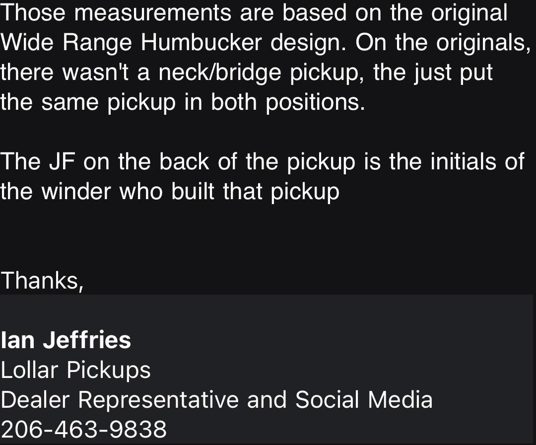 Predám krkový wide range humbucker Lollar Regal. Bol na často hranej gitare, takže má asi 10 ročnú patinu. Rozmer je F spaced, čo vychádza z pôvodného designu wide range humbuckerov.