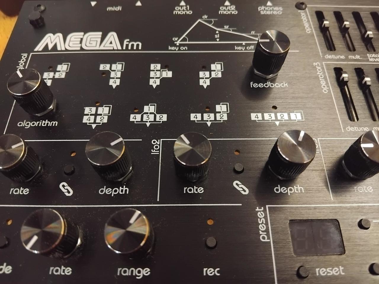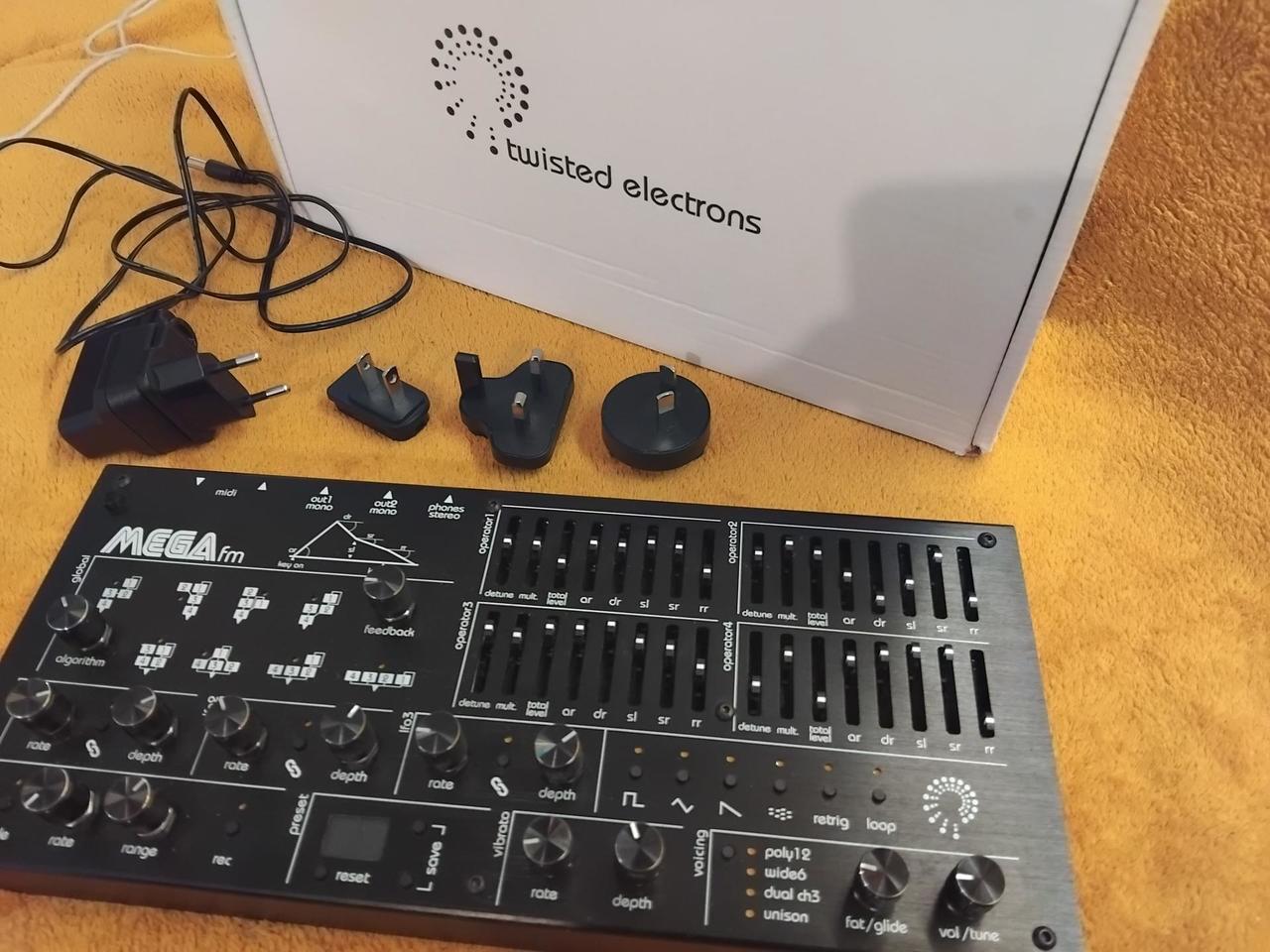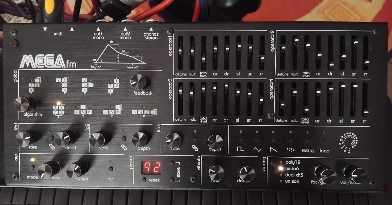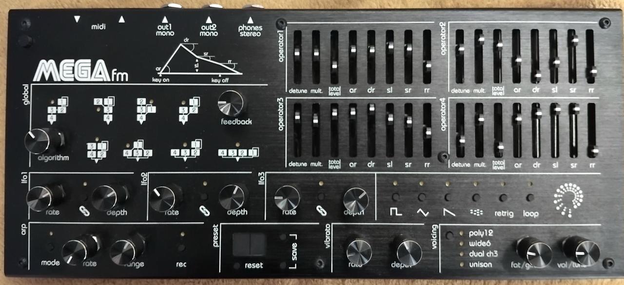 https://www.twistedelectrons.com/megafm https://www.youtube.com/watch?v=BZjD-CFG4r4 FM syntezátor 12 polyfonních hlasů Dva FM čipy YM3438 8 algoritmů 600 paměťových presetů v 6 bankách 4 hlasové režimy: Poly12, stereo/broadband6, speciální režim CH3, 12hlasý unisono Stereo nebo mono výstup (1 čip na kanál nebo oba čipy dohromady) 3 LFO pro modulaci libovolného parametru 7-režimový arpeggiátor s transpozičními krokovými sekvencery ve stylu Sh Vibrato s hloubkou a rytmem MIDI hodiny na všech LFO, ARP a vibrato Všechny fadery/knoby odesílají MIDI signál Jack výstupy: 2x 6,3 mm Stereofonní výstup pro sluchátka: 6,3 mm 5pinový DIN MIDI vstup s učení MIDI kanálů a MIDI Through/Out Pouzdro z kartáčovaného/eloxovaného hliníku Rozměry: 300 × 132 × 45 mm Včetně 9V DC napájení (kladný středový pól)