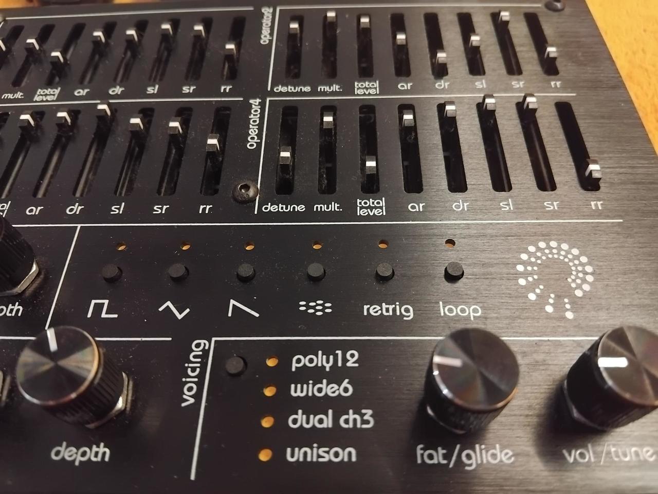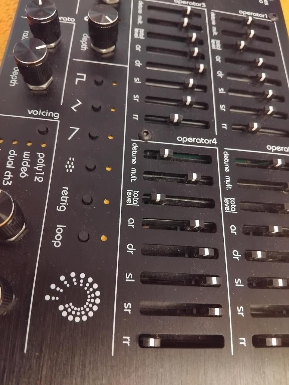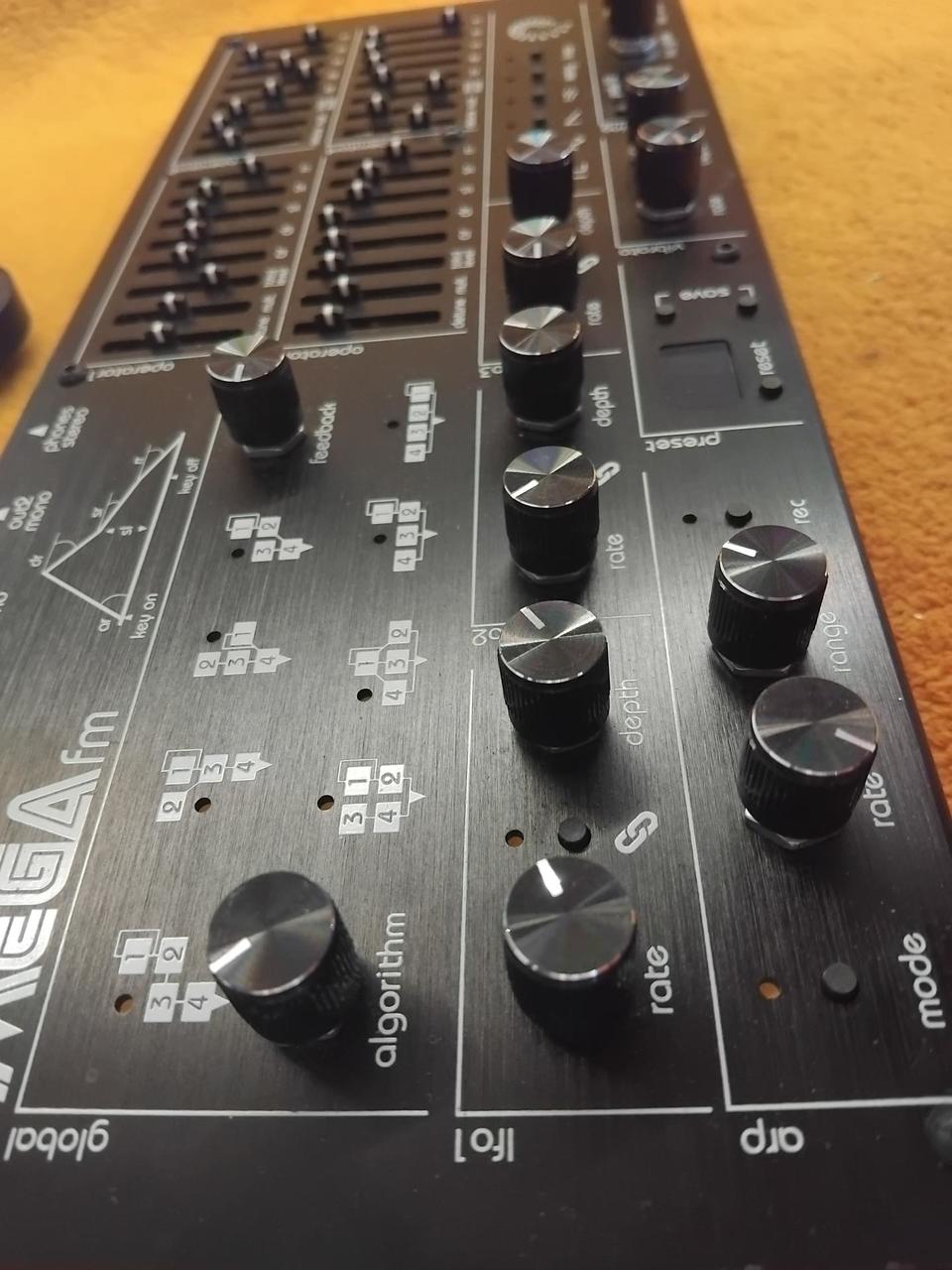https://www.twistedelectrons.com/megafm https://www.youtube.com/watch?v=BZjD-CFG4r4 FM syntezátor 12 polyfonních hlasů Dva FM čipy YM3438 8 algoritmů 600 paměťových presetů v 6 bankách 4 hlasové režimy: Poly12, stereo/broadband6, speciální režim CH3, 12hlasý unisono Stereo nebo mono výstup (1 čip na kanál nebo oba čipy dohromady) 3 LFO pro modulaci libovolného parametru 7-režimový arpeggiátor s transpozičními krokovými sekvencery ve stylu Sh Vibrato s hloubkou a rytmem MIDI hodiny na všech LFO, ARP a vibrato Všechny fadery/knoby odesílají MIDI signál Jack výstupy: 2x 6,3 mm Stereofonní výstup pro sluchátka: 6,3 mm 5pinový DIN MIDI vstup s učení MIDI kanálů a MIDI Through/Out Pouzdro z kartáčovaného/eloxovaného hliníku Rozměry: 300 × 132 × 45 mm Včetně 9V DC napájení (kladný středový pól)