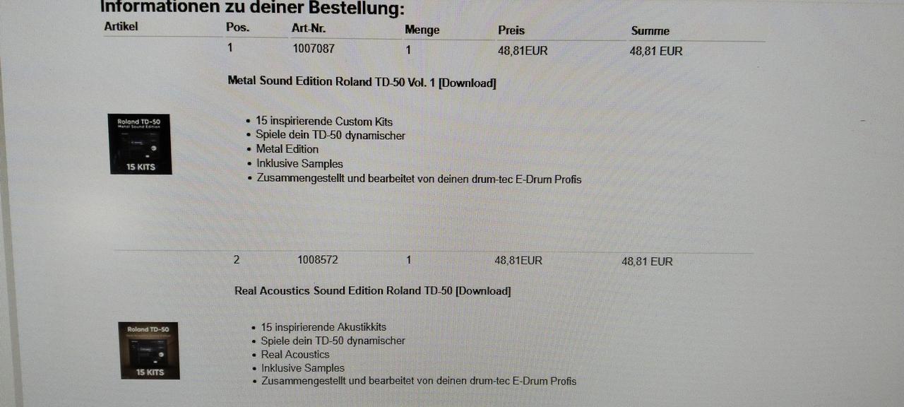 Nabízím možnost rozšíření bicího modulu Roland TD-50 o 15 akustických sad - " Metal Sound Edition Roland TD-50 Vol.". Koupil jsem je na Drum-Tec za 49 euro.