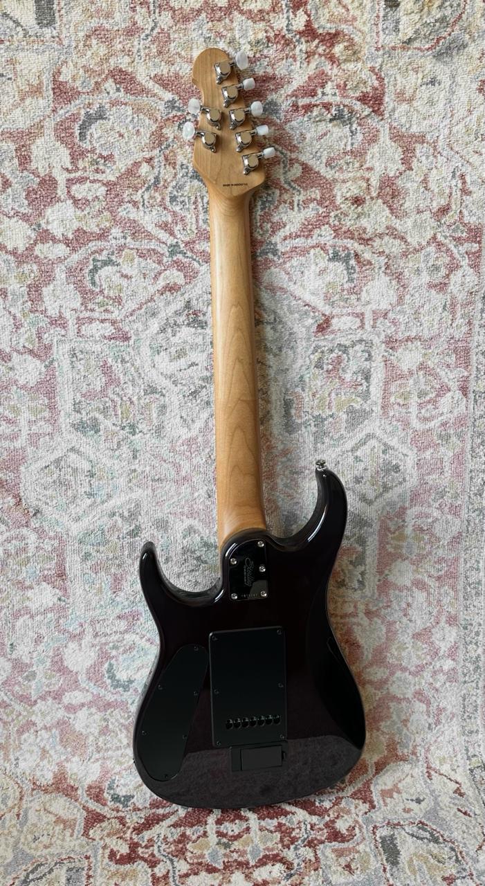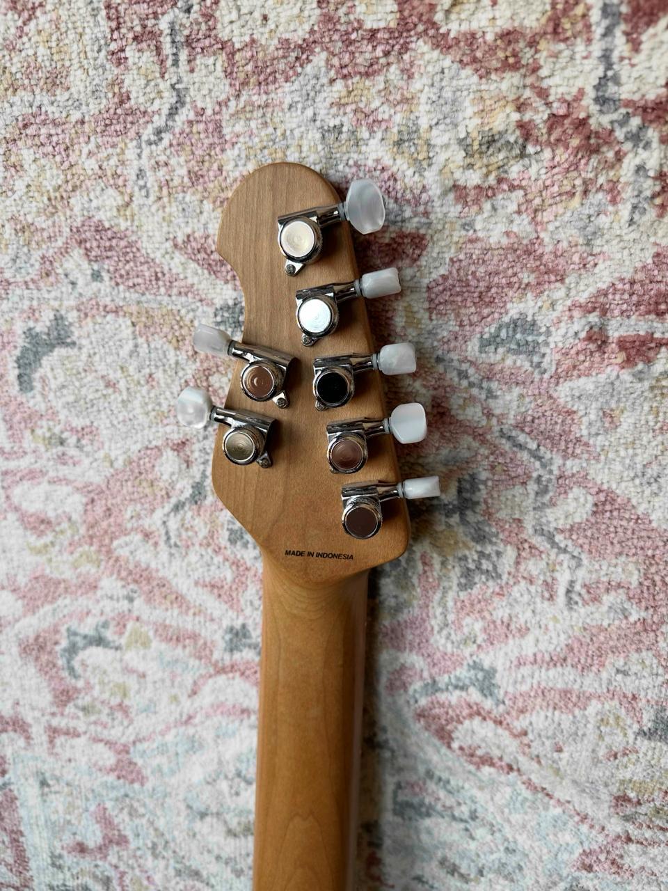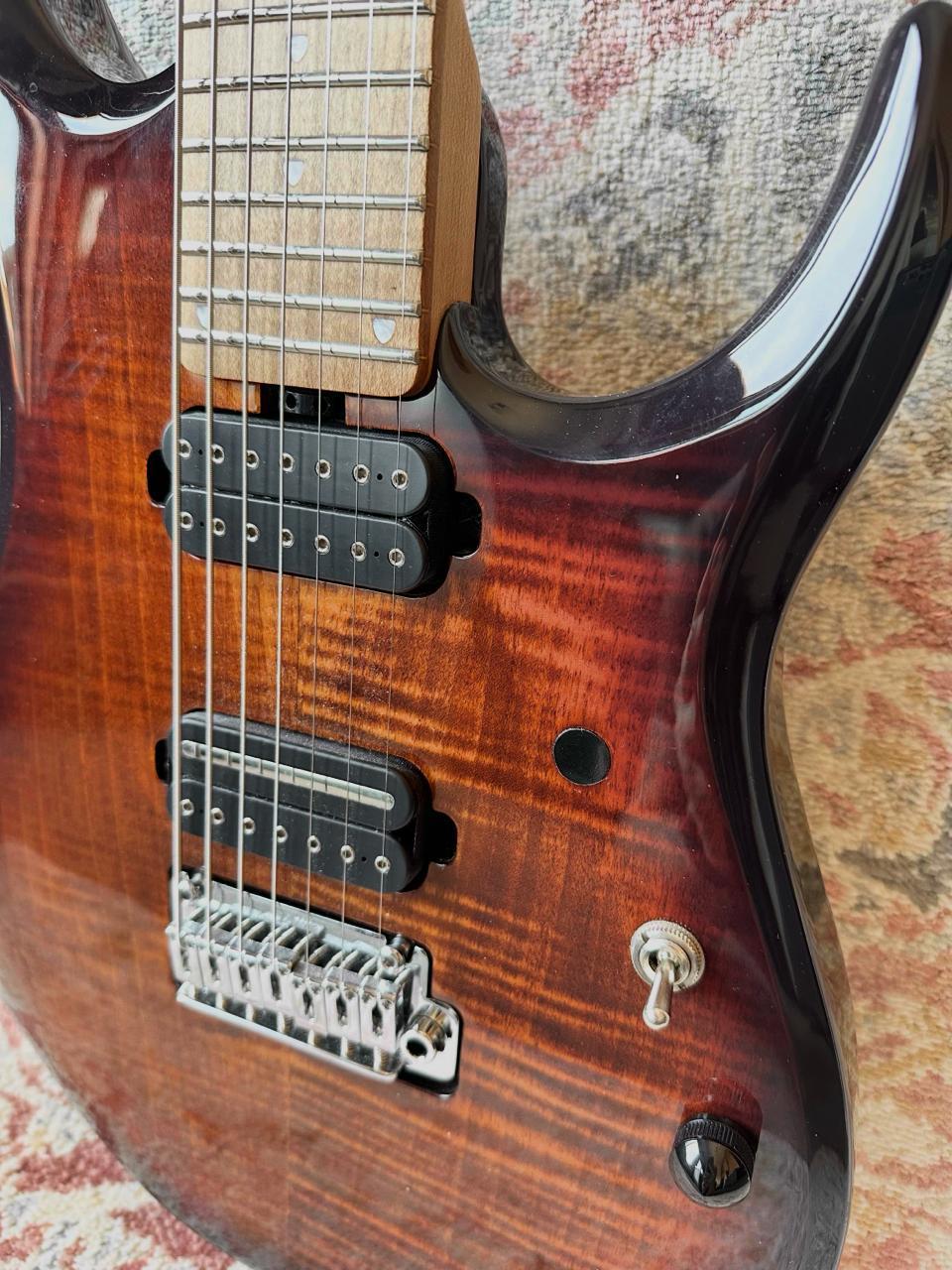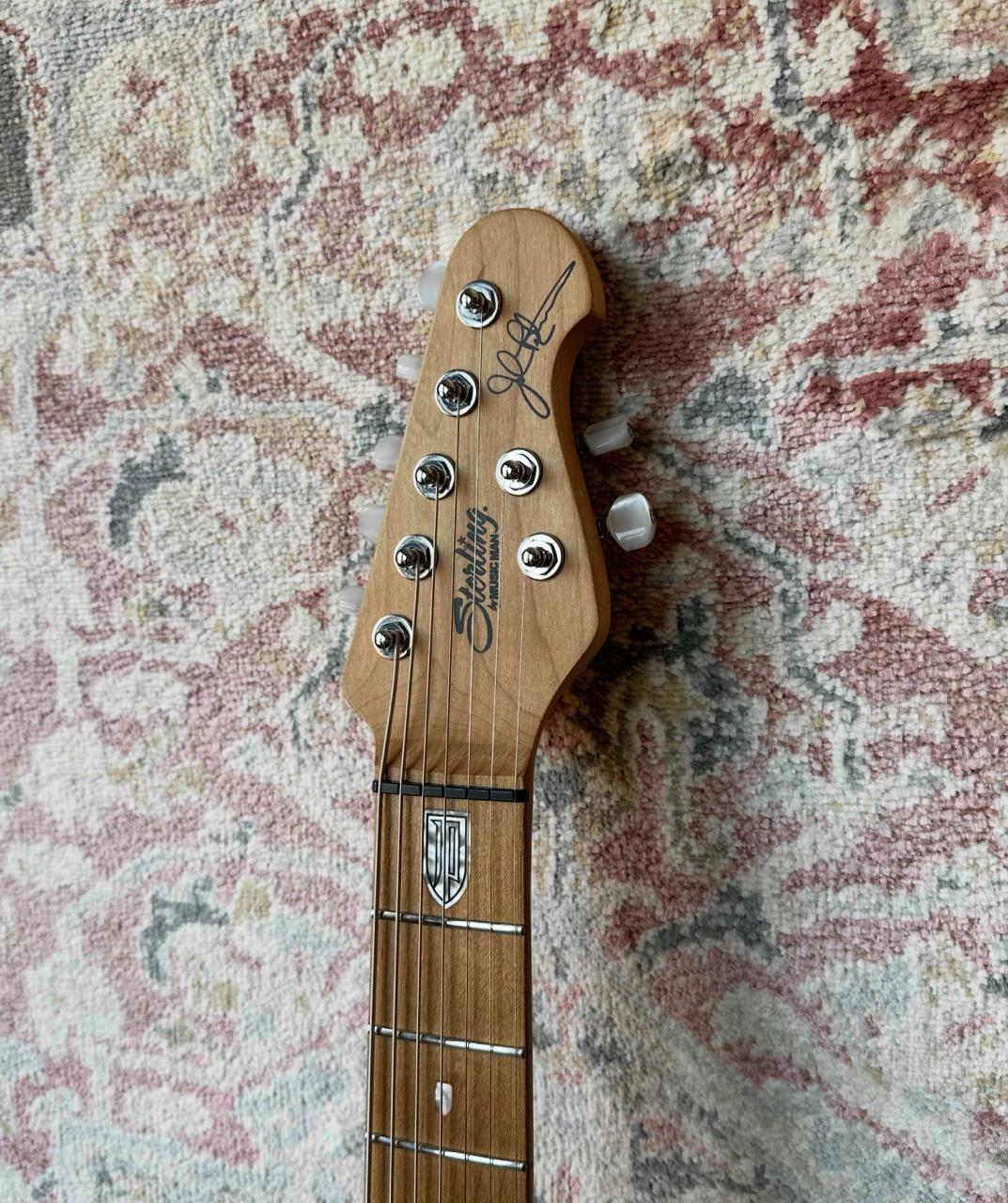 Snímače jsou DiMarzio Crunch Lab bridge a D-Activator neck. Funkce push-push potenciometru byla změněna z původního "12dB boost" na "coil-split". Protože mi při hraní překážel přepínač snímačů :/, posunul jsem všechno o jednu díru dál a tónovou clonu jsem dal stranou. Původní potenciometr i "boost" preamp jsou samozřejmě součástí prodeje, takže to můžete kdykoliv vrátit do původního stavu. Kytara je momentálně seřízená do Drop G# na strunách 10-68. Je to teď spíše moderní metalový nástroj než ve stylu Petrucci/Dream Theater. Snímače zvládají podladění naprosto skvěle, i Drop G je s těmito strunami v pohodě hratelné. Jinak je kytara ve skvělém stavu, má pohodlný krk a profesionálně zabroušené a srovnané pražce. Žádné ťukance, praskliny ani škrábance. Součástí je Deluxe Sterling gig bag. Specifikace: Tělo: mahagon s dýhou z žíhaného javoru (Flame Maple Veneer) Konstrukce: šroubovaný krk (5 šroubů) Krk: roasted maple Šířka nultého pražce: 49,5 mm (1.95'') Menzura: 25,5" (648 mm) Hmatník: roasted maple Rádius: 16" (400 mm) Pražce: 24 Medium Jumbo Mechaniky: uzamykatelné Kobylka: Modern Tremolo Dual Action Snímače: DiMarzio Crunch Lab (kobylka), DiMarzio D-Activator (krk) Elektronika: Původní 12dB boost (přibalen zvlášť) Ovládání: Volume (push-push coil-split), 3-polohový přepínač, Tone (momentálně odpojen/zvlášť) Pouzdro: Deluxe Sterling by Music Man Bag