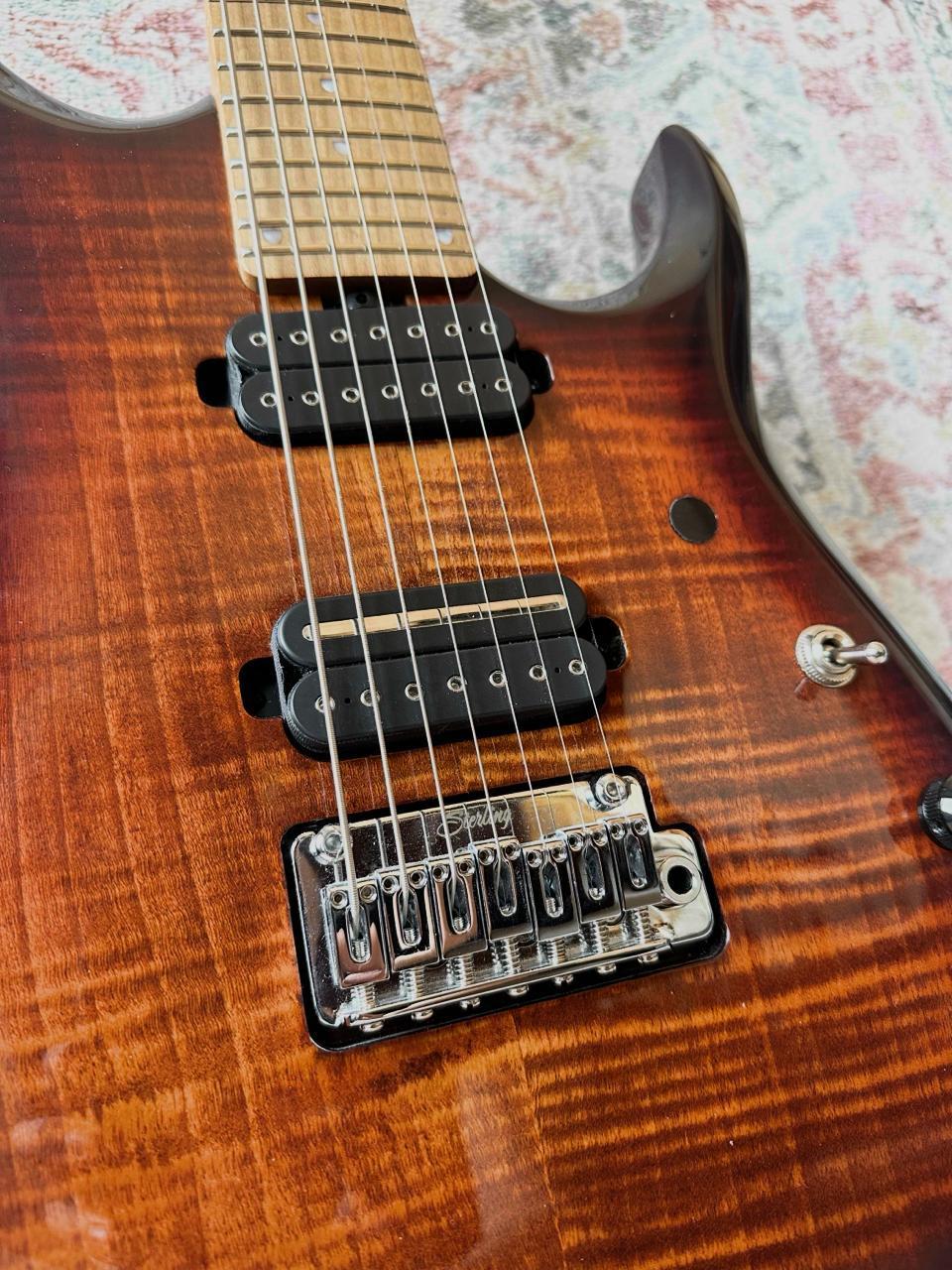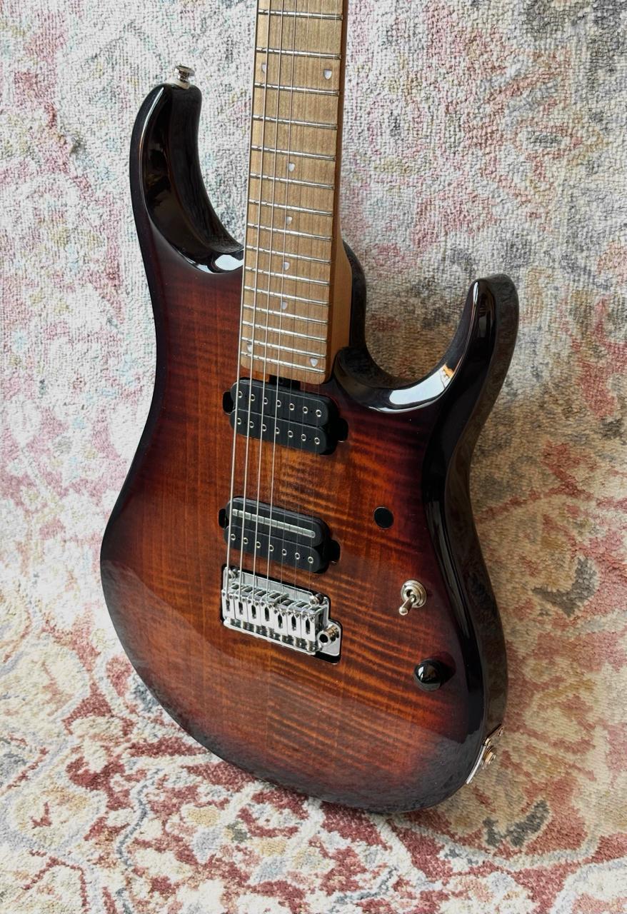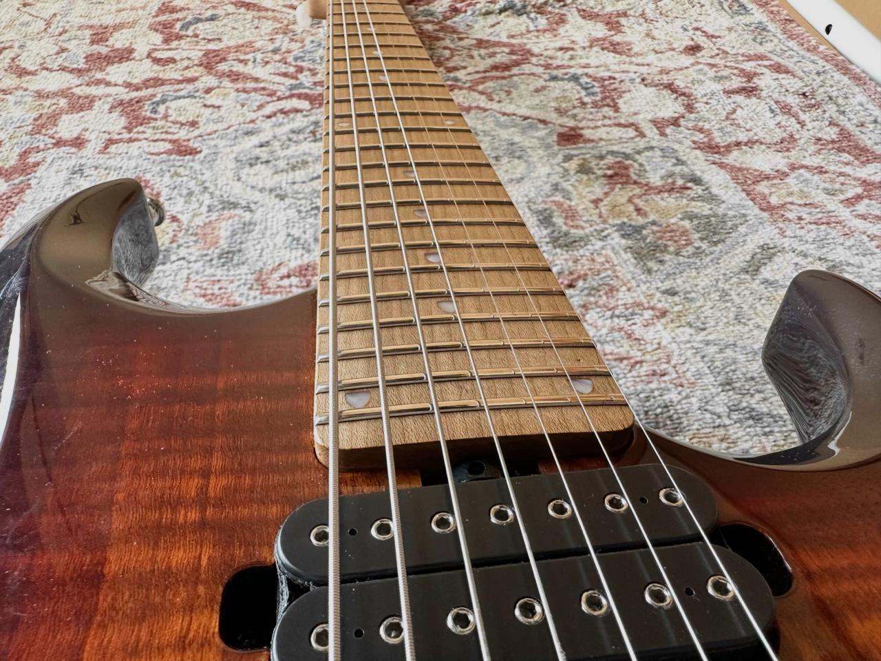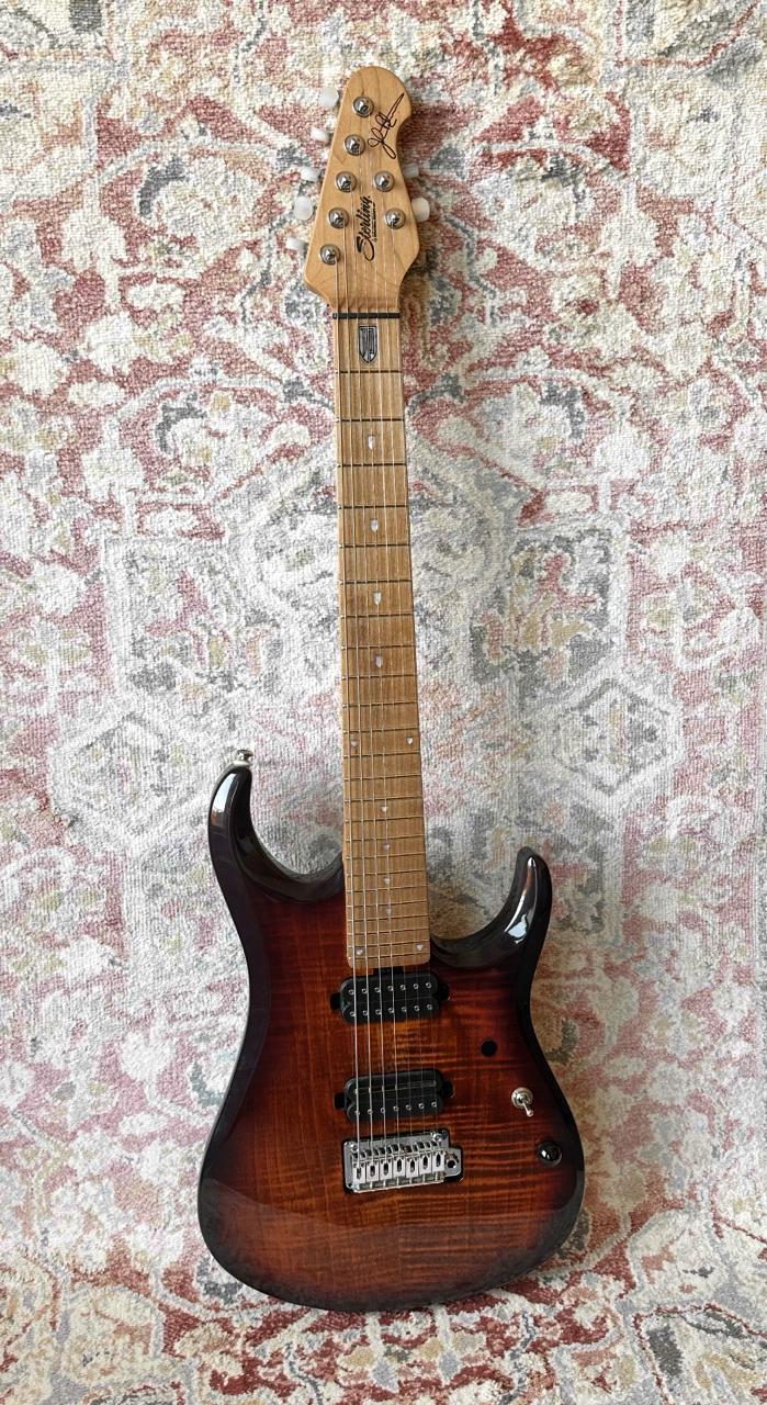 Snímače jsou DiMarzio Crunch Lab bridge a D-Activator neck. Funkce push-push potenciometru byla změněna z původního "12dB boost" na "coil-split". Protože mi při hraní překážel přepínač snímačů :/, posunul jsem všechno o jednu díru dál a tónovou clonu jsem dal stranou. Původní potenciometr i "boost" preamp jsou samozřejmě součástí prodeje, takže to můžete kdykoliv vrátit do původního stavu. Kytara je momentálně seřízená do Drop G# na strunách 10-68. Je to teď spíše moderní metalový nástroj než ve stylu Petrucci/Dream Theater. Snímače zvládají podladění naprosto skvěle, i Drop G je s těmito strunami v pohodě hratelné. Jinak je kytara ve skvělém stavu, má pohodlný krk a profesionálně zabroušené a srovnané pražce. Žádné ťukance, praskliny ani škrábance. Součástí je Deluxe Sterling gig bag. Specifikace: Tělo: mahagon s dýhou z žíhaného javoru (Flame Maple Veneer) Konstrukce: šroubovaný krk (5 šroubů) Krk: roasted maple Šířka nultého pražce: 49,5 mm (1.95'') Menzura: 25,5" (648 mm) Hmatník: roasted maple Rádius: 16" (400 mm) Pražce: 24 Medium Jumbo Mechaniky: uzamykatelné Kobylka: Modern Tremolo Dual Action Snímače: DiMarzio Crunch Lab (kobylka), DiMarzio D-Activator (krk) Elektronika: Původní 12dB boost (přibalen zvlášť) Ovládání: Volume (push-push coil-split), 3-polohový přepínač, Tone (momentálně odpojen/zvlášť) Pouzdro: Deluxe Sterling by Music Man Bag