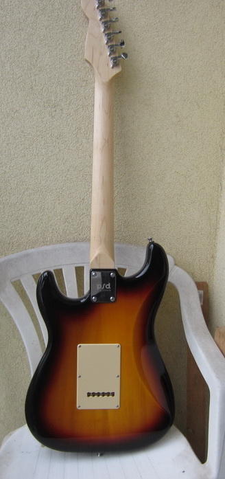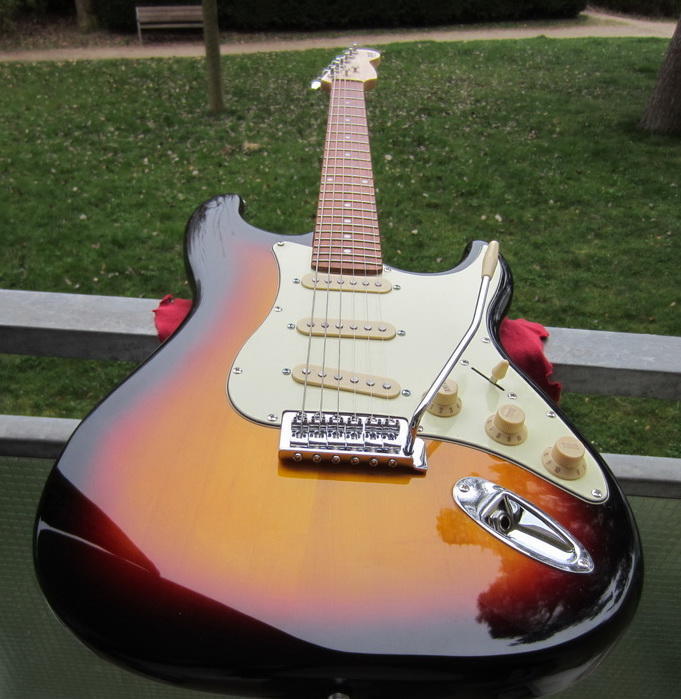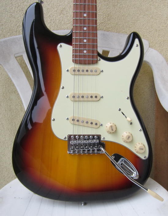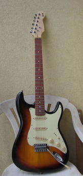 Tělo americká lípa, krk javor, povrchová úprava satin, hmatník palisandr (!), 22 pražců, nultý pražec syntetická kost. Skvělé začištění okrajů pražců-lepší, než na většině mexických Stratů! Vylepšení: výměna kobylkových kamenů za ocelové, výměna bloku tremola za silný masivní mosazný (delší sustain).
