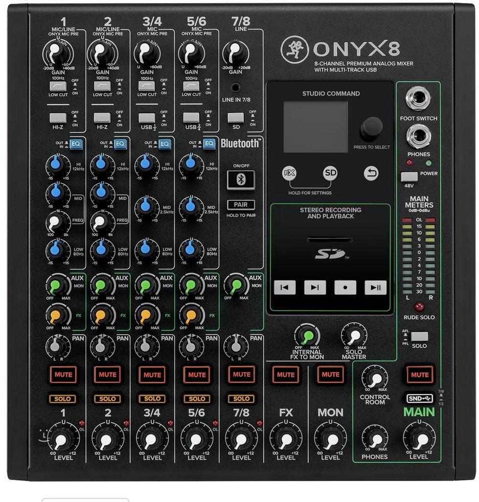 Mix je zároveň zvuková karta, stačí koupit paměť SD a okamžitě nahráváš svoje vysoupení. Vynikajícá přístroj do zkušebny. Použit párkrát ve studiu, než se ukázalo se, že potřebujeme ONYX 12, Proto je Onyx8 na prodej :-)