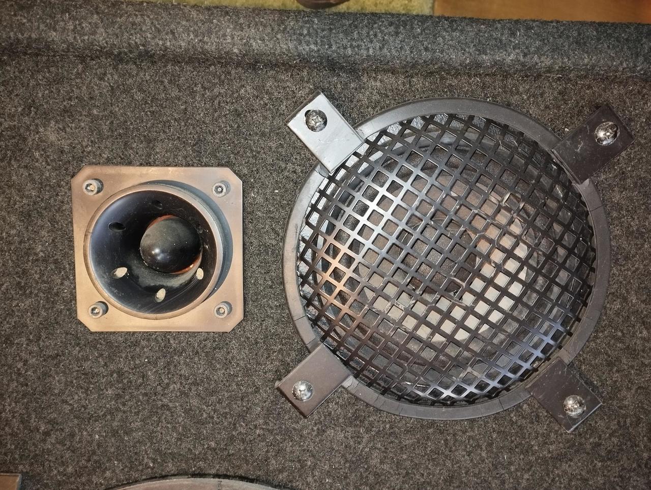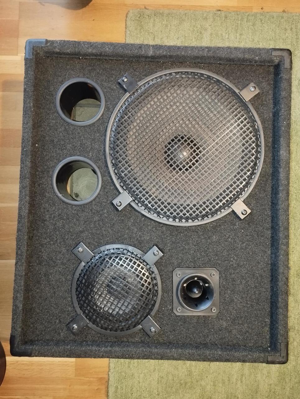 Prodám starou třípasmovou reprobednu. Basák je 15". Masivní výhybka, její součástí jsou 2 cívky, spousta svitkových kondenzátorů a dvě žárovky!?!