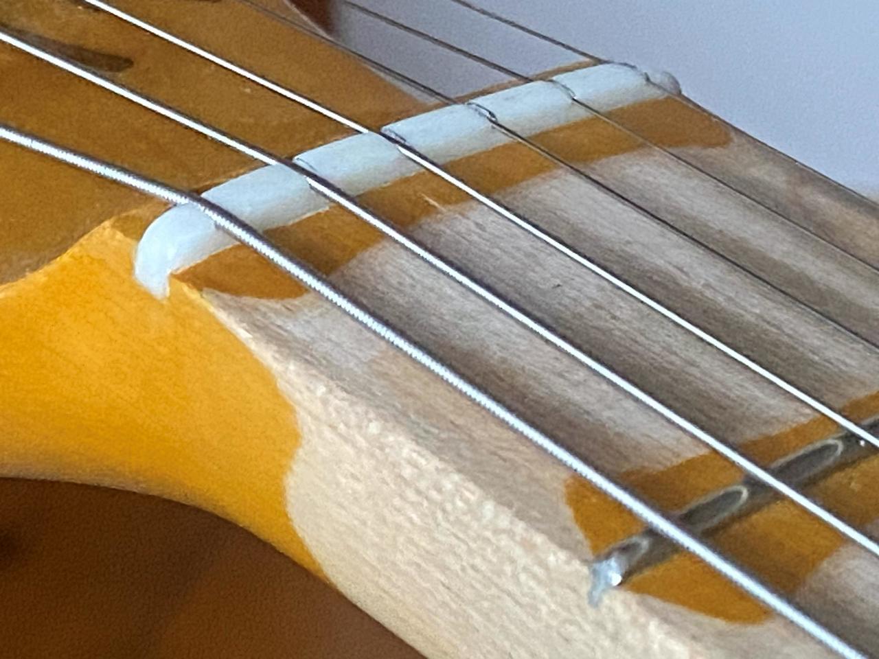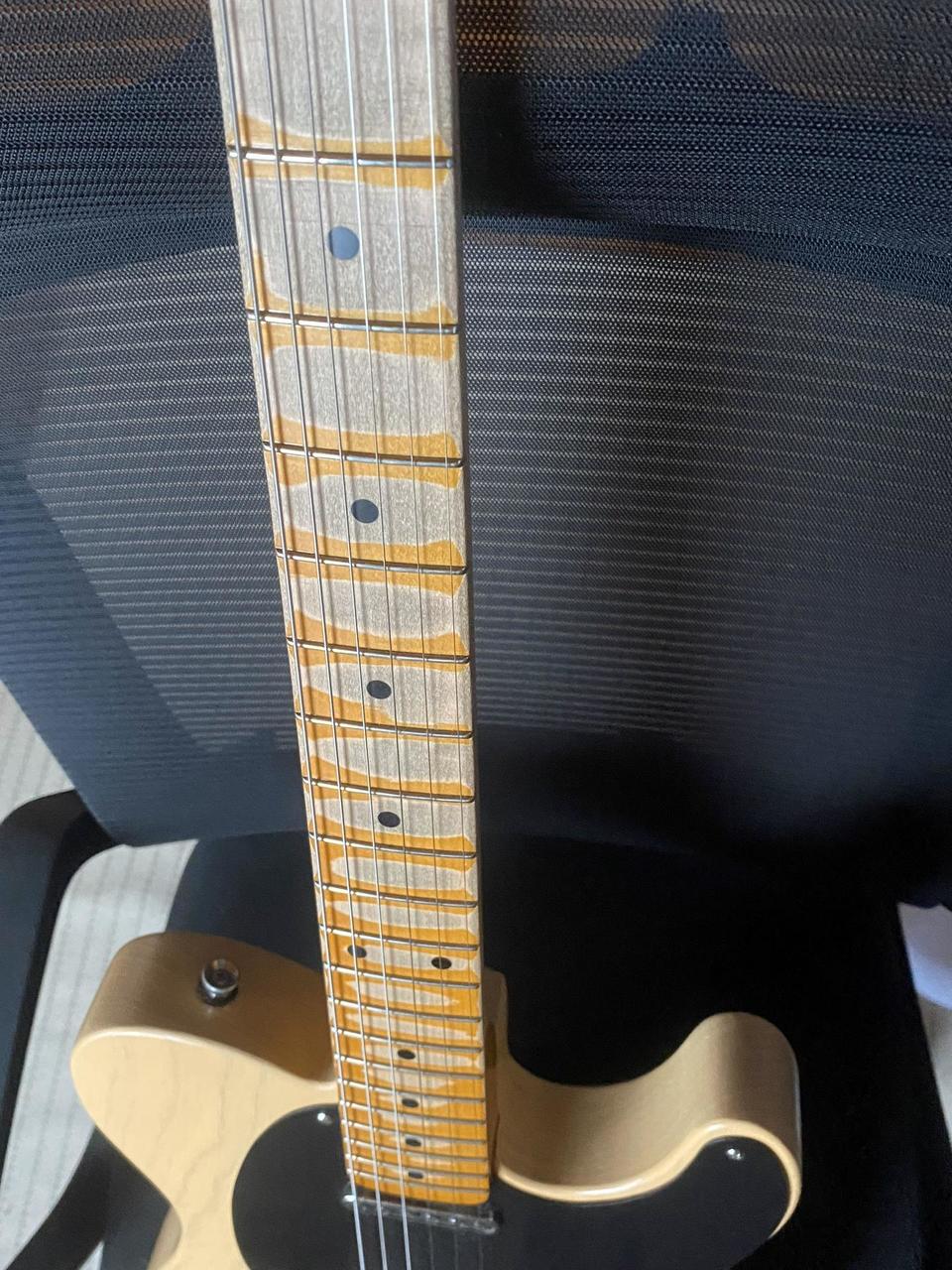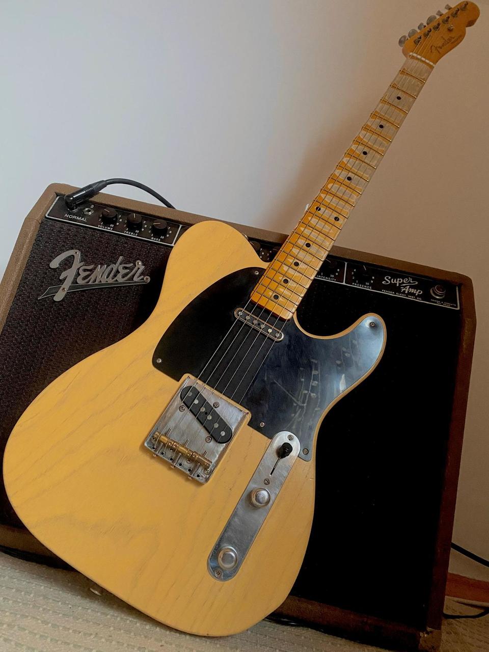 Tělo: 1 kus lehkého bahenního jasanu (tuším 1,6 kg) v nitrolaku - kupoval jsem ze Švýcarska od malého výrobce Krk: Allparts Fat Tele Neck 9,5" rádius jeden kus javoru, ladící mechaniky Kluson style, které mají zevnitř napsáno Made in Japan, nultý pražec neměl rovnoměrné rozteče strun, proto Honza Vlasák (Vivian Instruments) instaloval nový nultý pražec ze zvířecí kosti. Struny 10-46 Elixir. Pražce jsou ve velmi dobrém stavu. Snímače: Kobylka Lollar Vintage T Bridge 7,4 KOhm, Krkový snímač Lollar Royal T Neck 6,24 KOhm - tónová clona je pouze na kobylkovém snímači - můžu přepájet dle přání Kobylka je noname, Kameny jsou kompenzované mosazné Gotoh In-Tune BS T-Style Krytky potenciometrů jsou Fender Roadworn Prodávám, protože mám ještě jeden partscaster, který mi sedí víc. Krk je díky částečně sejmutému laku a zakulaceným hranám velmi pohodlný a rychlý, přestože je celkem tlustý. Akusticky hlasitá kytara.