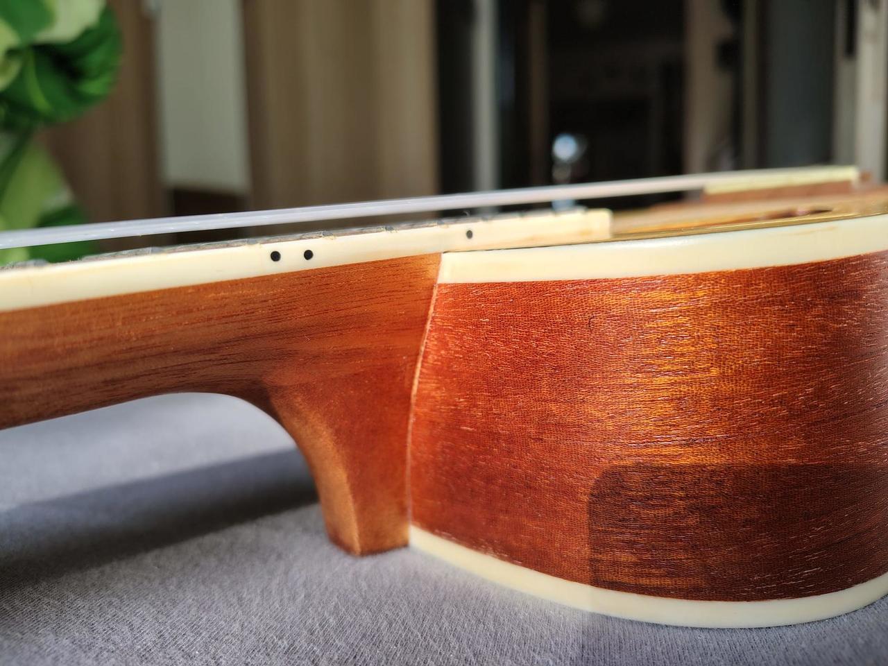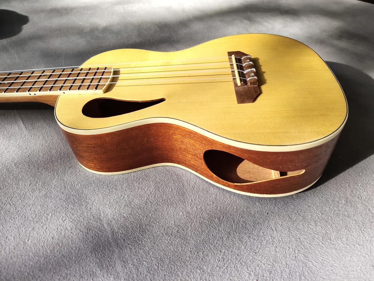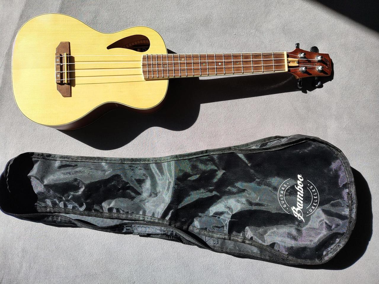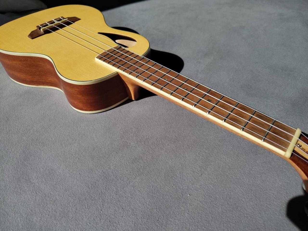 Nabízím nevyužité tenorové ukulele s obalem. Zadní deska a luby jsou vyrobeny ze sapele, top nástroje je smrkový. Krk uchycený k tělu v úrovni čtrnáctého pražce je vyroben také ze sapele a má pohodlný profil klasického C. Přiléhá k němu palisandrový hmatník osazený osmnácti pražci. Struny jsou uchyceny v palisandrové kobylce, o bezchybné ladění se spolu s ní starají chromované mechaniky Die Cast s černými plastovými kolíčky. Nástroj má kromě přívětivých rozměrů také extrémně nízkou hmotnost 0,3 kg.