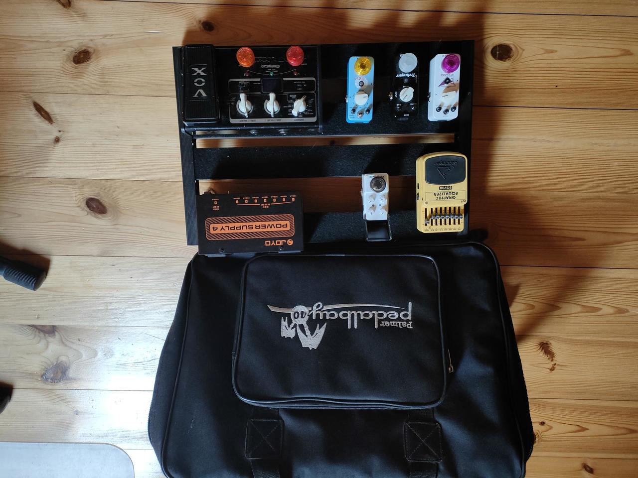 Prodám pedalboard s přenosnou taškou a vybaven multiefektem Vox Stomplab, dále efekty Wah, Tremolo, Vibrato, Equalizer, Boost a síťové trafo. Efekty jsou od firem Behringer, Mooer, Joyo. Včetně propojovacích kabelů.