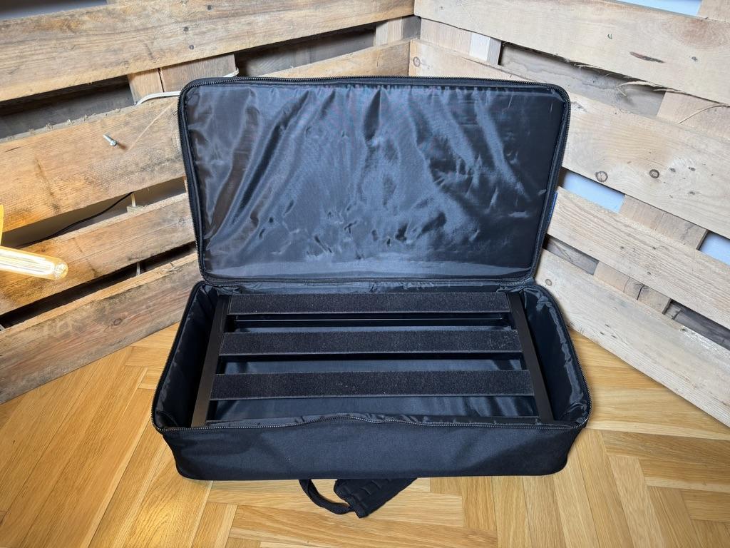Je to ideální velikost pro středně velký rig – s přehledem se na něj vejde 8 až 12 krabiček (podle velikosti). Díky vyvýšené zadní straně se pod něj pohodlně schová většina standardních napájecích zdrojů. Stav pedalboardu a obalu: Konstrukce: Hliníkový rám je naprosto v pořádku. Má jen drobné oděrky od běžného používání a přenášení, nic hrozného. Suchý zip (Velcro): Na lištách je nalepená měkká strana suchého zipu, drží perfektně. Obal: Polstrovaná taška je ve skvělém stavu, zipy fungují hladce, nikde není protržená, jediná vada na kráse je přezka na popruhu, kterou jsem obešel. Základní parametry: Rozměry rámu: 55,9 x 31,8 x 8,9 cm Materiál: lehký letecký hliník Hmotnost samotného boardu: cca 1,36 kg Součástí prodeje je: Hliníkový pedalboard Pedaltrain Classic 1 Originální polstrovaný obal (Soft Case) s popruhem přes rameno Důvod prodeje: Helix Cena: 2 500 Kč Předání: Osobní vyzkoušení a předání je možné v Turnově. Po domluvě mohu pečlivě zabalit a odeslat přes Zásilkovnu / PPL / Balíkovnu (při platbě předem na účet, případně na dobírku).
