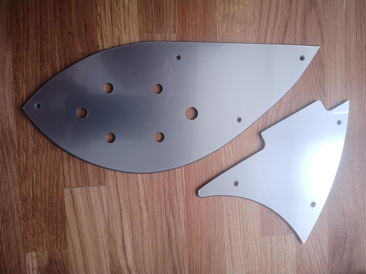 Moc pěkný dvoudílný pickguard z akrylového skla v metalicky stříbrné barvě (stejný materiál, jako jsou pickguardy Gretsch).