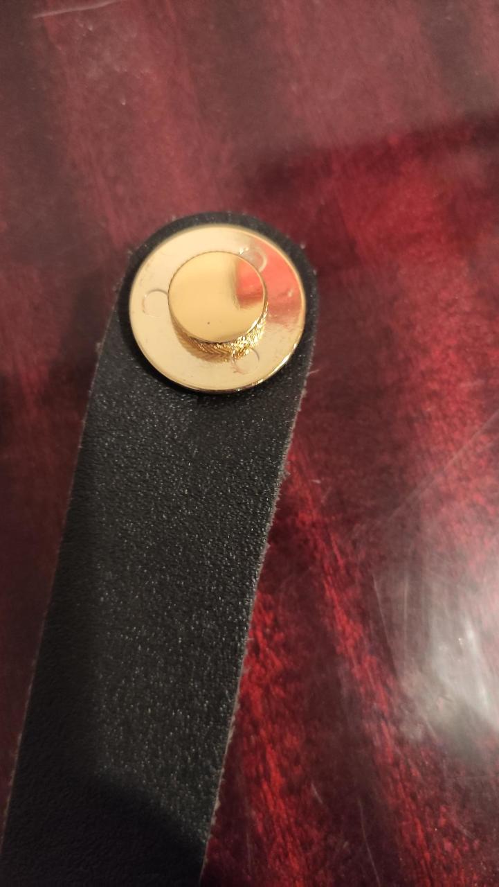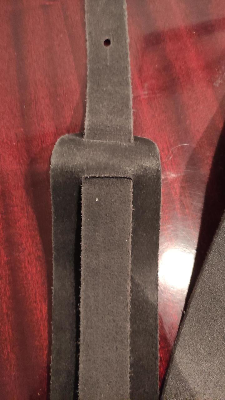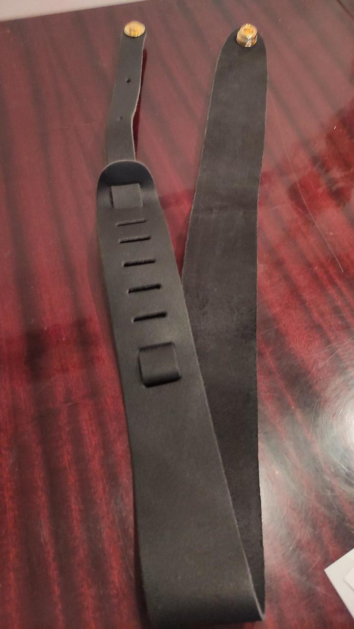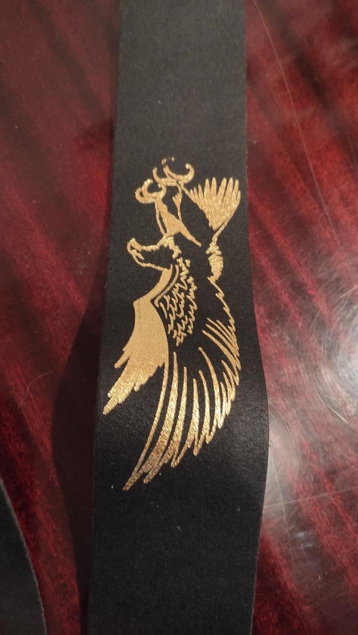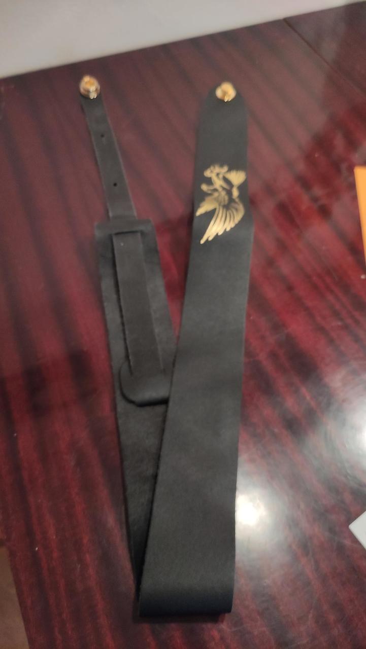nepoužitý popruh kůže kvalitní řemen je vyroben z kůže se zlatým potiskem. šířka 6,4 centimetrů, délka lze nastavit mezi 101 a 129 centimetry. pro kytaru, baskytaru, původní cena 640 kč.
