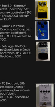 Vše poslouží začátečníkům či pokročilým fungovalo dobře, něco krátce neco dlouze, kdybyste chtěli nějaké další fotky není problém. Kytara: - Harley Benton HWY-25BKS Progressive Series - seřízená, málo hraná (PC - 2900); i s příslušenstvím (elixir struny, černý popruh, lehký obal) za 3000 Efekty na e. kytaru: - Zoom G5n Kytarový multiefekt - používaný, ale bez známek opotřebení, párkrát na stagi, jinak studio. (PC - 6500) Nechám i s adaptérem a kvalitním pevným kufrem za 5000 - Boss SD-1 Kytarový efekt - používaný, bez známek opotřebení. (PC - přes 2000) Nechám za 1500 - Caline CP-19 Blue Ocean - používaný, bez známek opotřebení. (PC - 1000) Nechám za 700 - Behringer DR600 - používaný, bez známek opotřebení. (PC - 800) Nechám za 500 - TC Electronic 3RD Dimension Chorus - používaný, bez známek opotřebení. (PC - 800) Nechám za 600 Další hudební věci: - Harley Benton SpaceShip 60XL - používaný jednou za měsíc po dobu dvou let, bez známek opotřebení. Včetně obalu a suchých zipů (PC - 1700) Nechám za 1500 - Behringer X AIR XR12 Digitální mixpult - nový, použitý jednou, nakonec nevyužiji. (PC - 7000) Nechám za 6750 - Millenium DI-33 - nový, použitý jednou, nakonec potřebuji stereo. (PC - 700) Nechám za 700, ještě v záruce - Meinl Snarecraft Mini Cajon Almond - Skoro nevyužitý, drobné známky opotřebení (PC - 700), nechám za 500 - Stojan na dvoje klávesy - funguje skvěle (PC 3500), jen po používáni odpadla kroutící hlavice jednoho utahovacího šroubu - nic co by nešlo vyřešit - nechám za 2500 Notebook: - Lenovo V130-15IKB - Intel Core i3, 4 GB RAM, 256 GB SSD, 15,6" displej, Windows (tovární nastavení), Wi-Fi, HDMI, USB, na kancelářskou práci/web/filmy dostačující (PC 13000)nechám i s taškou - 5000