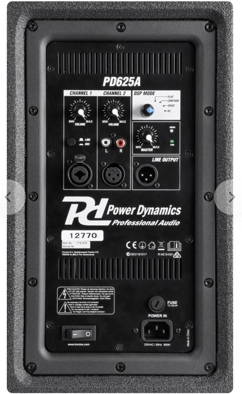 Tyto aktivní 2x 15" PA reproduktory mají hudební výkon 800 W, což vytváří hladinu akustického tlaku 135 dB. PD625A má 4 volitelné přednastavené režimy pro nastavení zvuku Flat, DJ, Contour a Voice. Vestavěný limiter poskytuje zabezpečení proti zkreslení vaší hudby. Cena 40 000,- za pár/ původní cena 27 499,- Kč/ks Vlastnosti v bodech: - 800 W Bi-amp 2x 15" reproduktor - Line a mikrofonní vstup - Vestavěný aktivní obousměrný crossover - 4 Přednastavené volby ekvalizéru - Efektivní zesilovač třídy D - Lichoběžníkový design pro použití jako jevištní monitor - 35 mm montážní otvor pro umístění na stativ nebo sloup Technické parametry: - Výstupní výkon: Max 1600 W - Výstupní výkon: 800 W - Výstupní výkon: RMS 600W - Zesilovač typu: Bi-amp třídy D + AB - Průměr výškového reproduktoru: 1,75" - Průměr basového reproduktoru: 15" - Počet basových reproduktorů: 2 - Hlasová cívka: 3" - Frekvenční odezva: 35 - 20 000 Hz - Vyzařovací úhel: 90 ° x 60 ° - Impedance: 4 Ohms - Citlivost: 106 dB - Crossover frekvence: 3,3 kHz - SPL max: 135 dB - Rozměry (D x Š x V): 467 x 435 x 1125 mm - Hmotnost (kg): 37