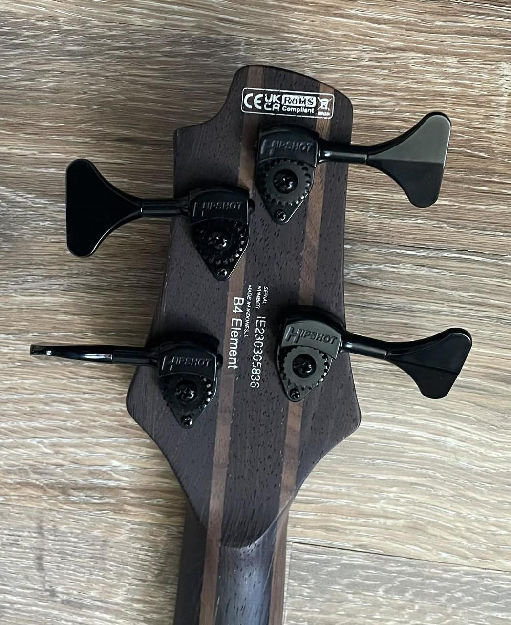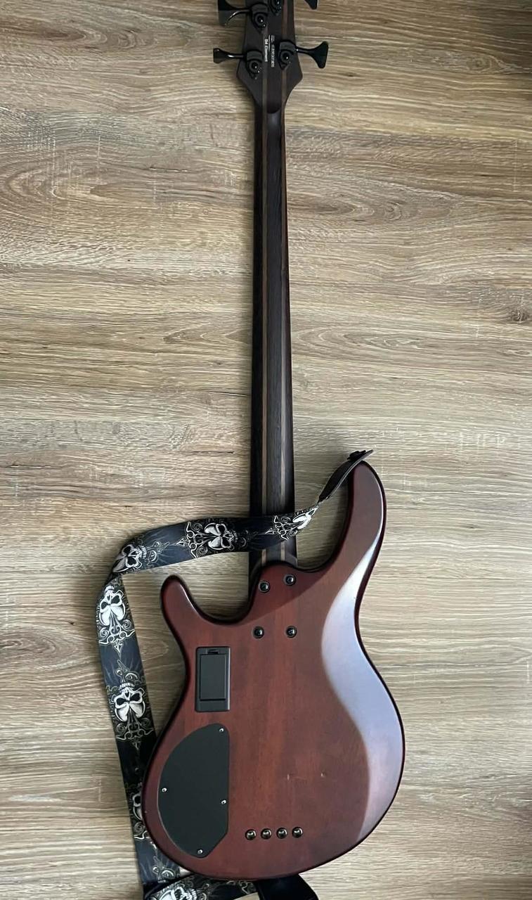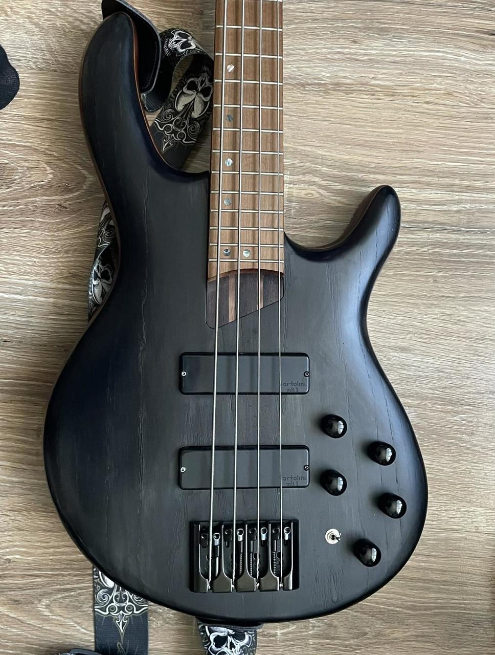 Vršek: Jasan Šroubovaný 5dílný krk: Panga panga / ořech Hmatník: Pražený javor Poloměr hmatníku: 400 mm (15,75") Měřítko: 864 mm (34") 4 pražců Snímače: 2x Bartolini MK-1 humbuckery Aktivní předzesilovač Bartolini MK-1 s 3pásmovým ekvalizérem 1x ovládání hlasitosti a 1x ovládání vyvážení Mini přepínač pro aktivní/pasivní Most Metalcraft M4 Hipshot Ultra mechaniky Černý hardware Struny: Daddario EXL 165, niklové vinutí, .045 - .105 Povrchová úprava: Otevřené póry Barva: Transparentní černá........ NUTNO DOLADIT TROCHU OKTAVY.