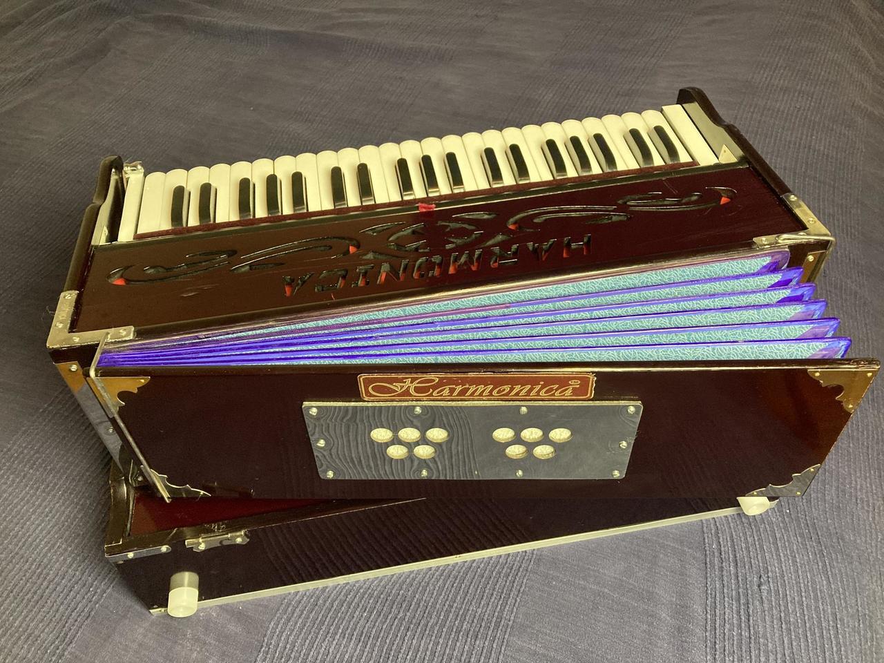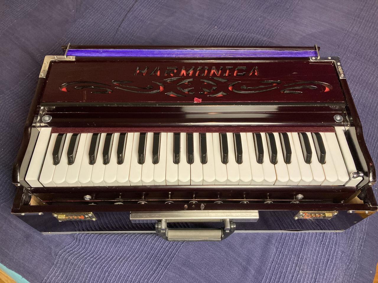 prodám indické harmonium „Harmonica“. 3,5 oktávy, kufříkové, přenosné, rozkládací. dvouhlasé (dvě sady jazýčků), vibrato, 4 doprovodné noty. váha cca 12 kg, rozměry 21x35x59 cm. jedná se o levnější nástroj, ale v rozumné kvalitě, s pěkným zvukem. v laku jsou různé škrábance a nedokonalosti z výroby, ale měchy a hrací mechaniky jsou solidní. pouze osobní předání. po Praze a blízkém okolí dovezu, po domluvě možná i dále.