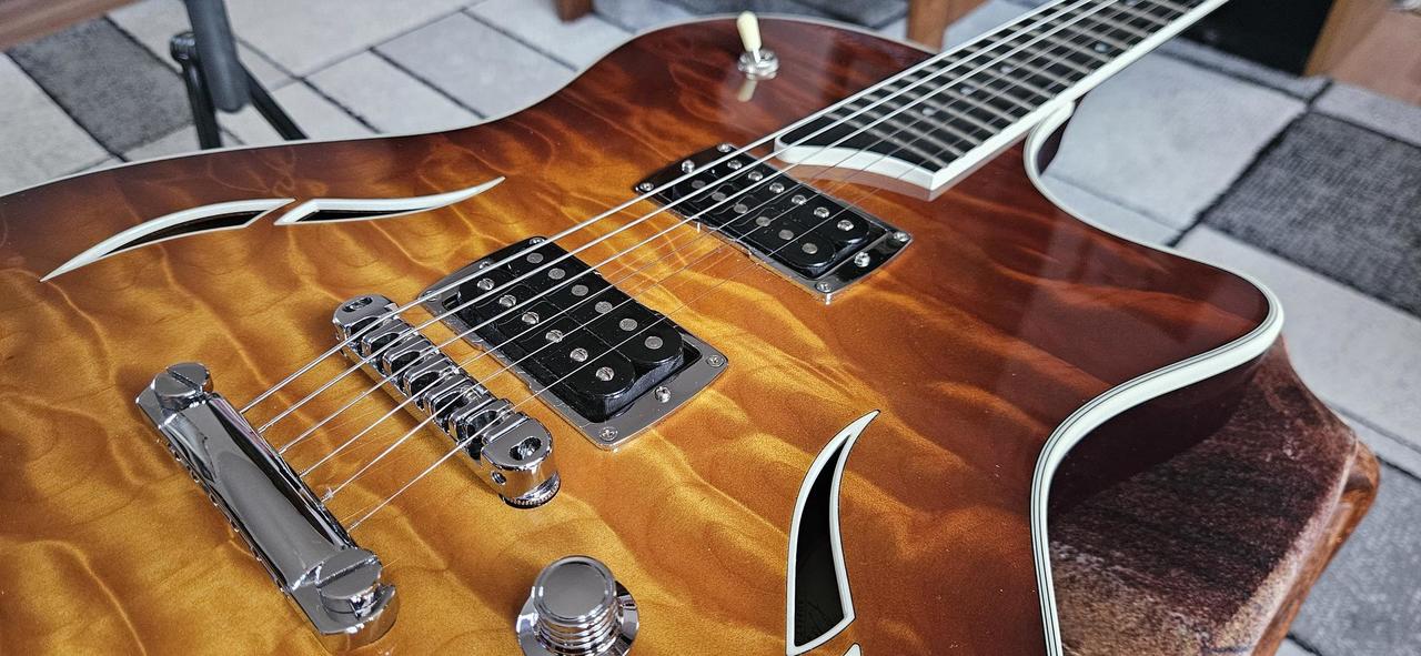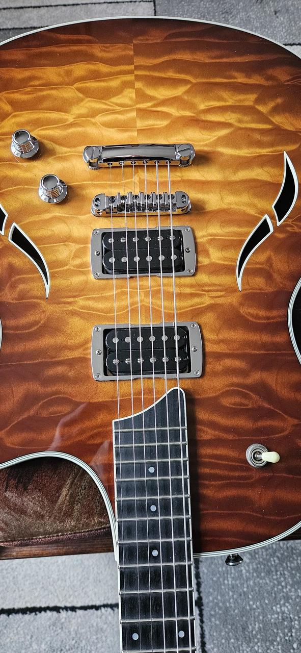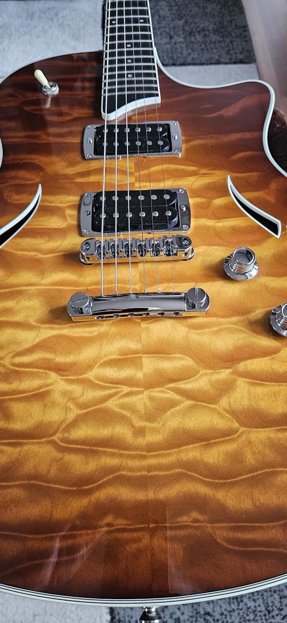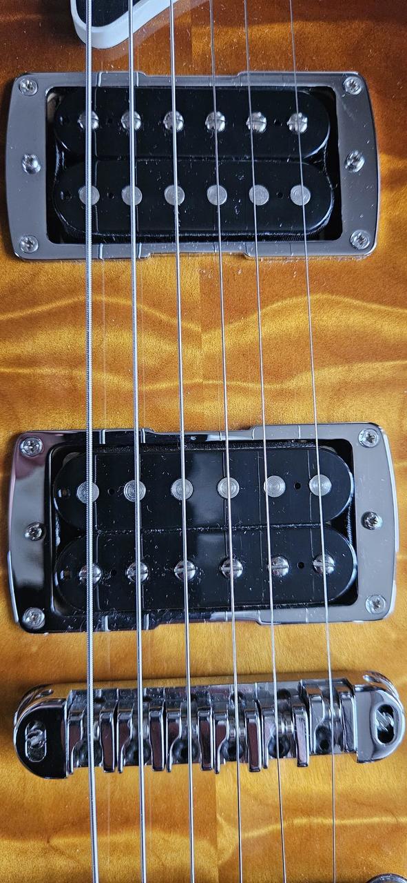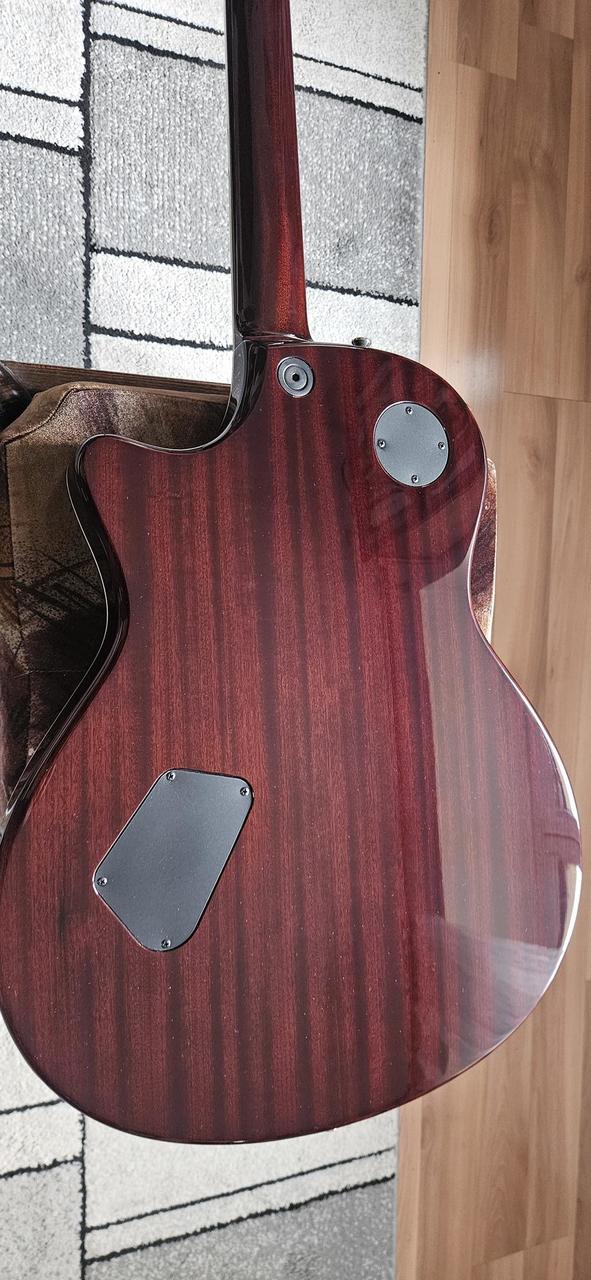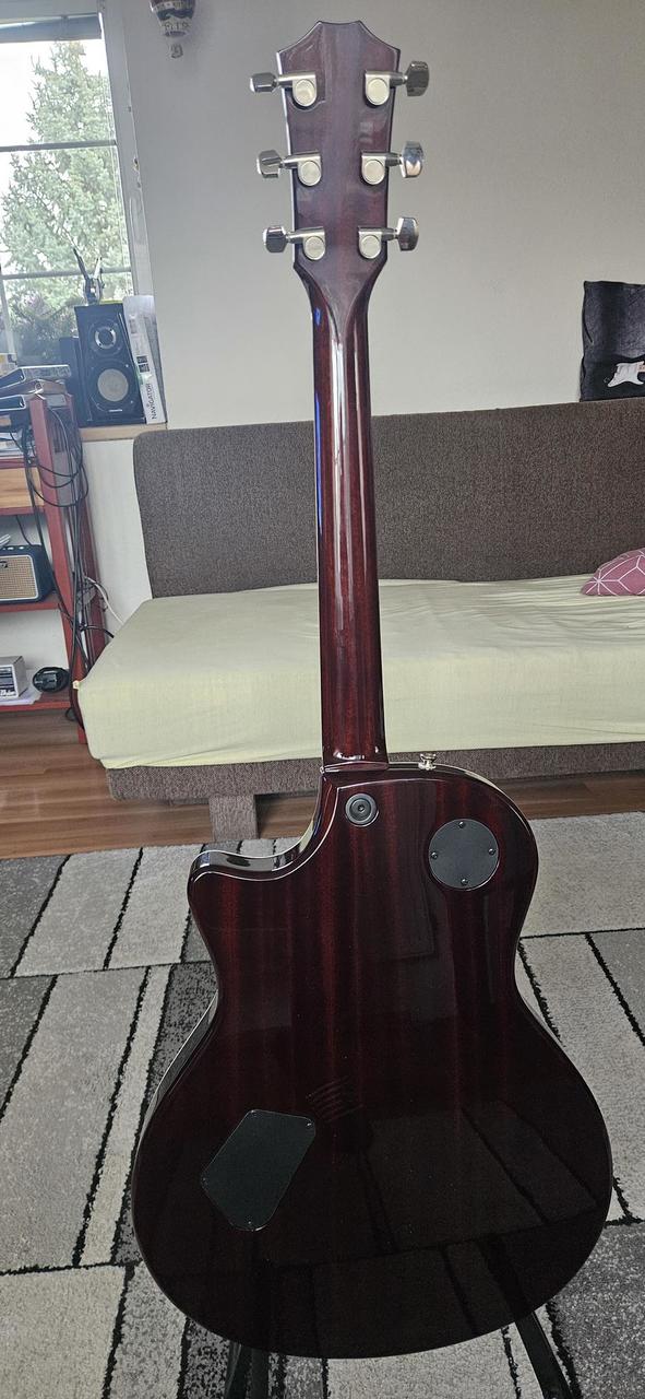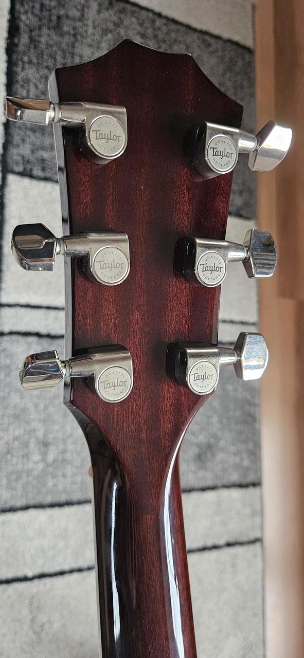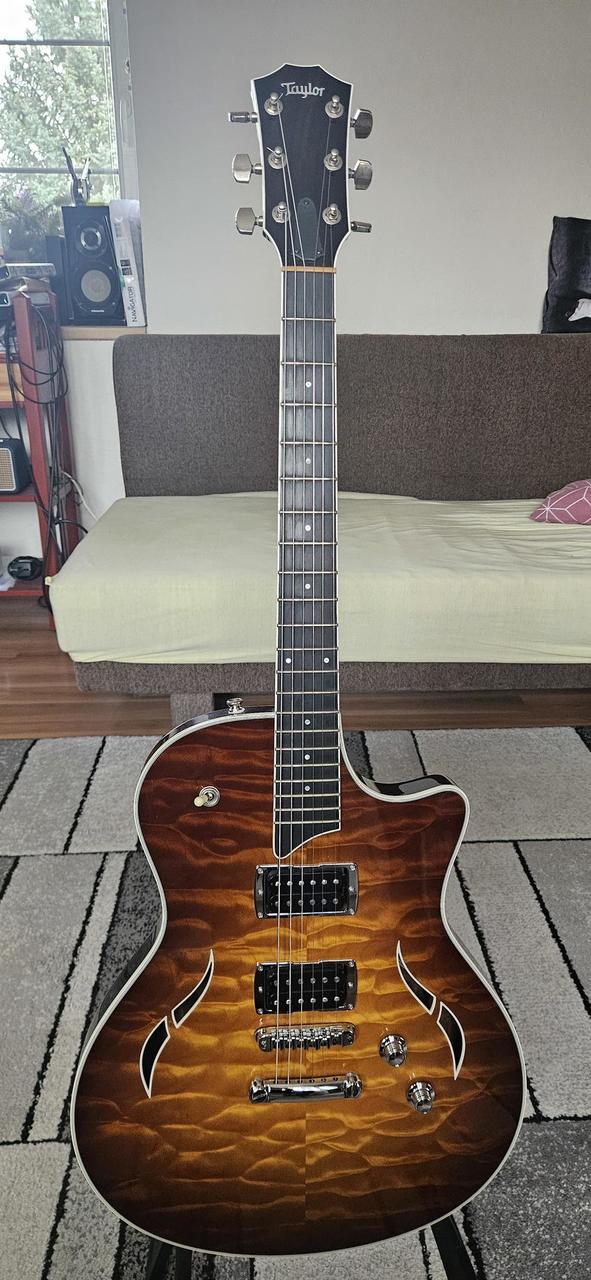 Tělo a krk Tělo tohoto nástroje silné 59,7 mm je vyrobeno z dvou částí: přední deska je z masivního fládrovaného javoru, luby a zadní deska z masivního sapele, což je druh afrického mahagonu. Krk je k tělu přišroubován speciálním způsobem T-Lock, který umožňuje přesné nastavení jeho polohy a perfektní přenos vibrací, tudíž skvělý sustain. Na krk je použito též dřevo sapele. Hmatník je ebenový a na menzure 628 mm nalezneme 21 pražců. Šířka nultého pražce odpovídá 42,8 mm. Snímače a elektronika O snímání zvuku se zde starají dva humbuckery, konkrétně jde o typ Taylor HD Humbuckers, Díky push/pull potenciometru lze humbuckery rozepnout na single-coily. Zvuk se dá ovlivňovat potenciometry hlasitosti a tónové clony, přičemž Tone na prvních dvou třetinách dráhy funguje jako klasická tónová clona, ale v poslední třetině začne přidávat středy. Hardware Hardware nástroje je chromovaný. Struny jsou uchyceny v mechanikách typu Die-Cast, na druhé straně vedou přes pevnou ložiskovou kobylku do stoptailu. Stabilita ladění a skvělý sustain jsou zaručeny. Na nástroj se továrně natahují struny Elixír Light Gauge Nanoweb® (011 – 049). Kytara je jako nová.Luxusní kufr.Jsem první majitel,koupeno Kytary.cz